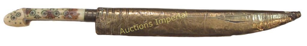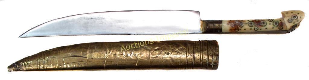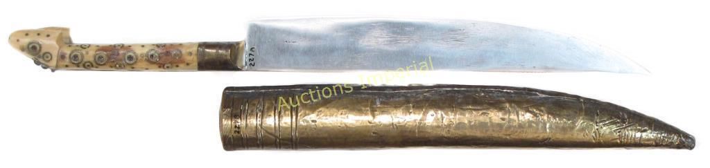 The eared grips of bone, well- inlaid with brass. Broad, single-edged blade with collection number at left forte. Sheath of wood covered in brass with incised lines. 19th century. Overall length 36.1 cm.