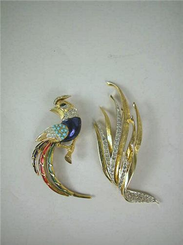A BOUCHER GILT METAL AND RHINESTONE LEAF-FORM BROOCH, missing a few rhinestones or piece of metal under leaf, 3-3/4"l, together with an unsigned Boucher metallic enamel and rhinestone bird-form brooch, set with white crystals, blue faux turquoise, #1088, 3"h