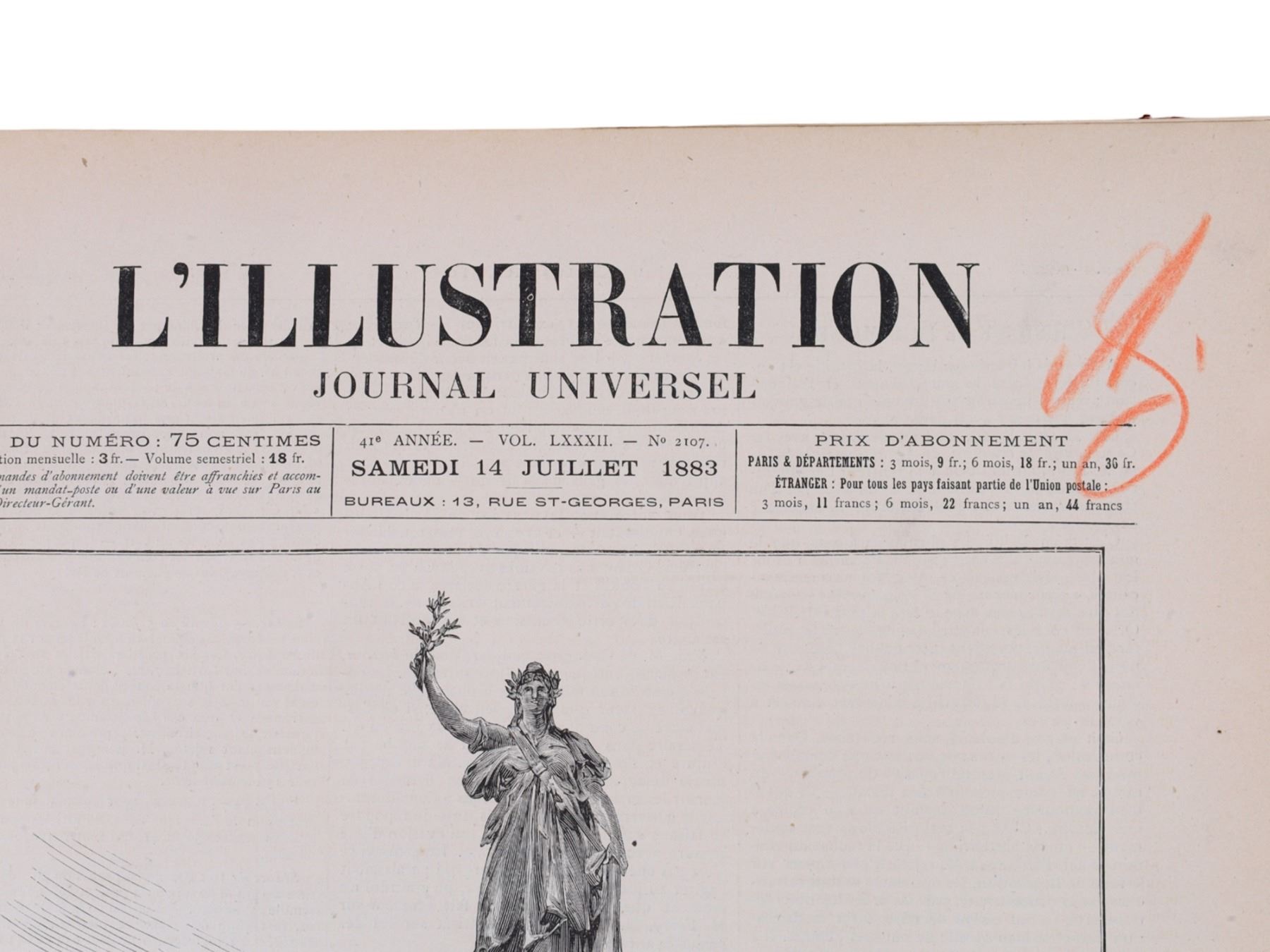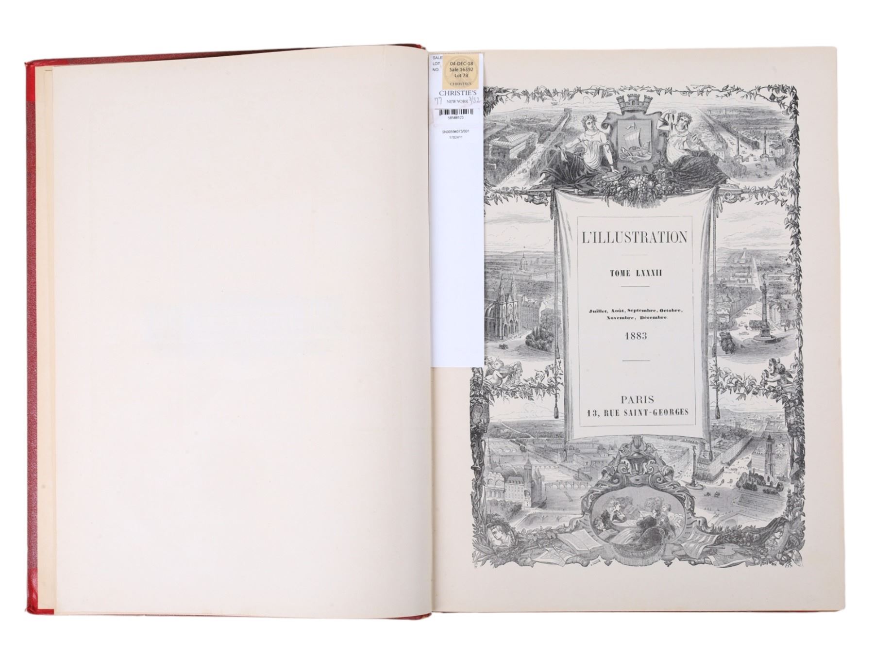 Description: A red morocco leather-bound set of the famous French newspaper/magazine 'L'Illustration', interspersed with 24 initials of Alexander III in red pencil at the corners of the first page of each issue. Previously sold at Christie's Auction House and retaining their tag in the front of the book. Many exquisitely detailed engravings throughout.