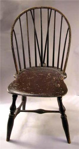 A BOW BACK BRACE-BACK RED-PAINTED WINDSOR SIDE CHAIR; Rhode Island, the molded rail above a nine- spindle-inset back, shaped seat and bulbous legs