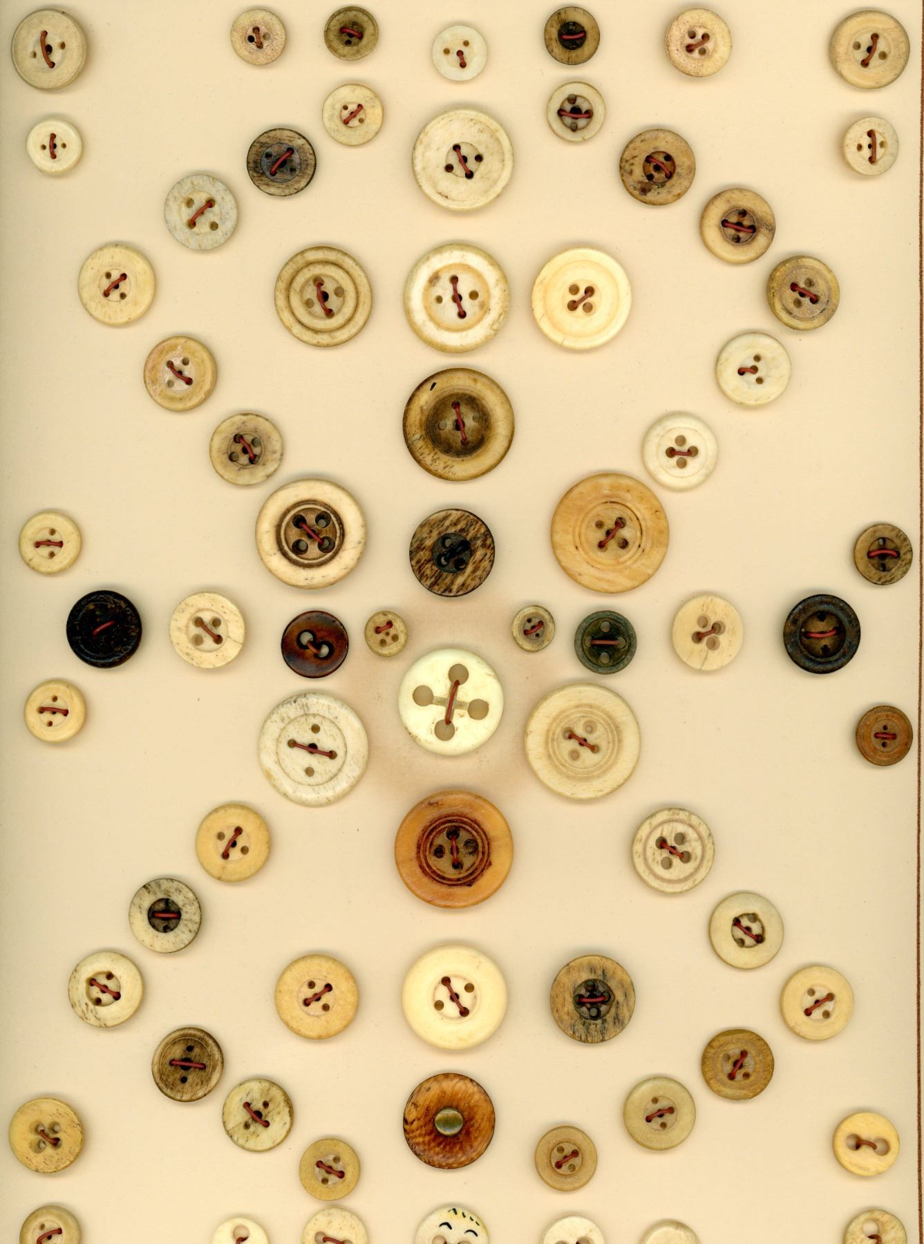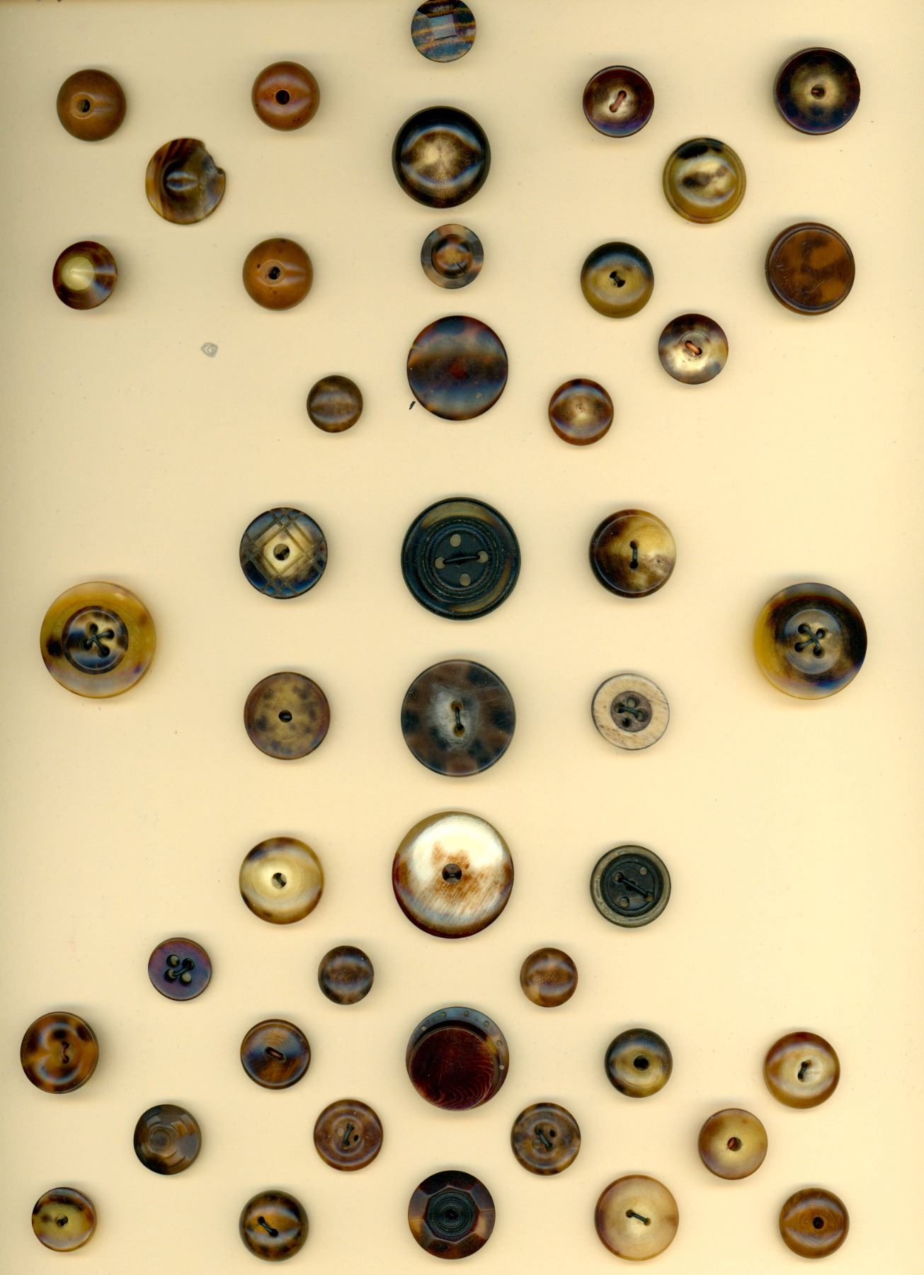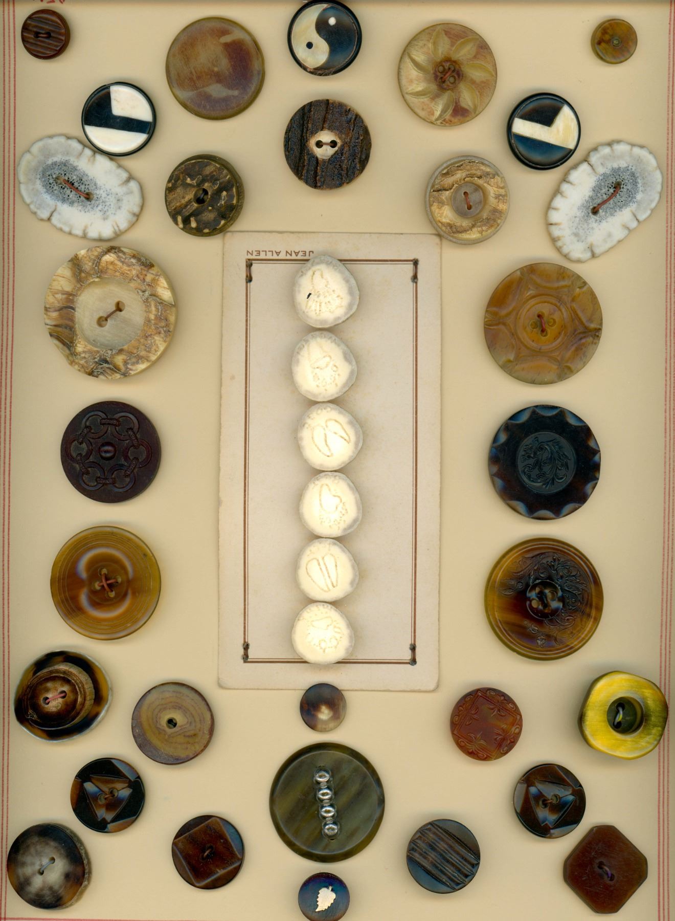 221 S/M/L 19th C. horn and bone buttons including underwear. This lot includes a selection of those utilitarian bone underwear sew thru buttons that are very earthy and useable for creators. The lot also includes natural and dyed horn examples, lots and lots of patterns including Ying Yang, and more.