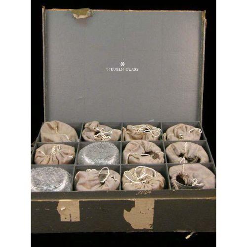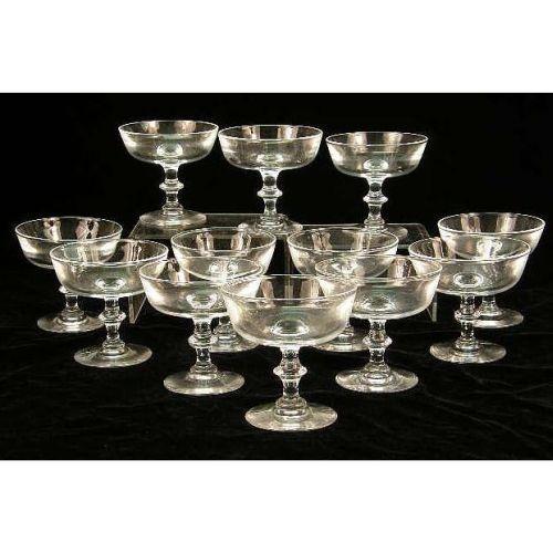 A BOXED SET OF COLORLESS GLASS STEUBEN CHAMPAGNE GLASSES<BR><BR>Losses and wear, 12 pieces