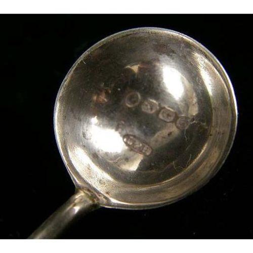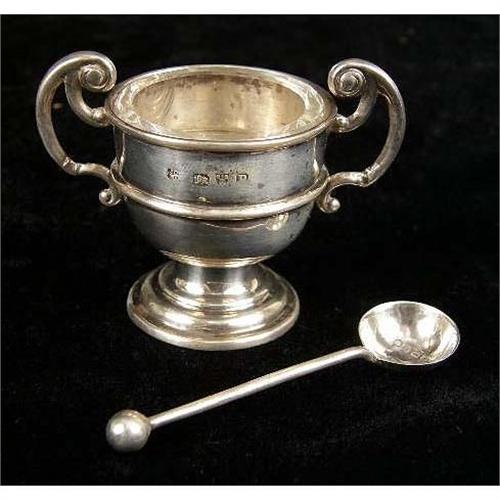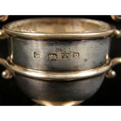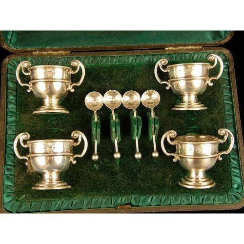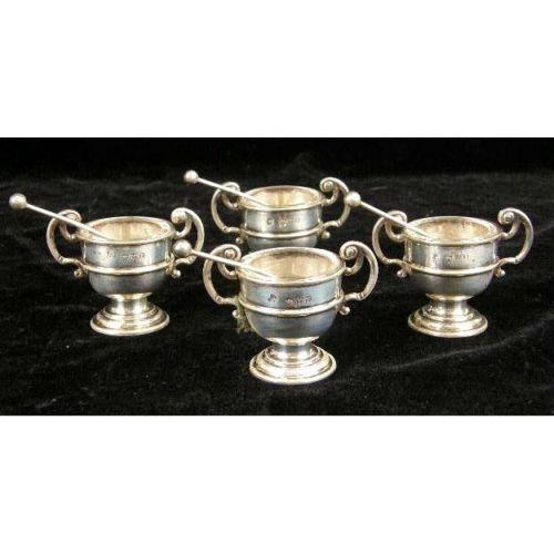 A BOXED SET OF ENGLISH STERLING SILVER FOUR SALTS WITH COLORLESS GLASS LINERS AND SALT SPOONS<BR><BR>Hallmarked JDWD, Chester, 1898, each salt of loving cup shape, 1-3/4"h, in fitted hinged case, total weight apx, 3 T.O.