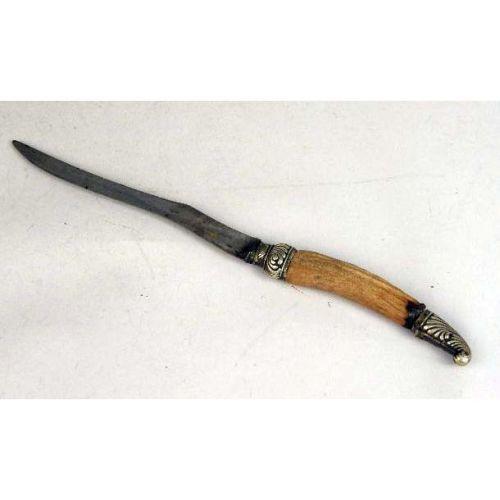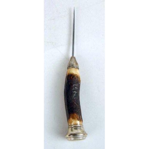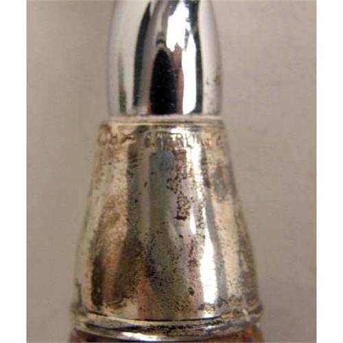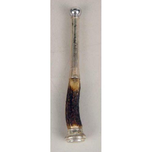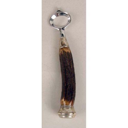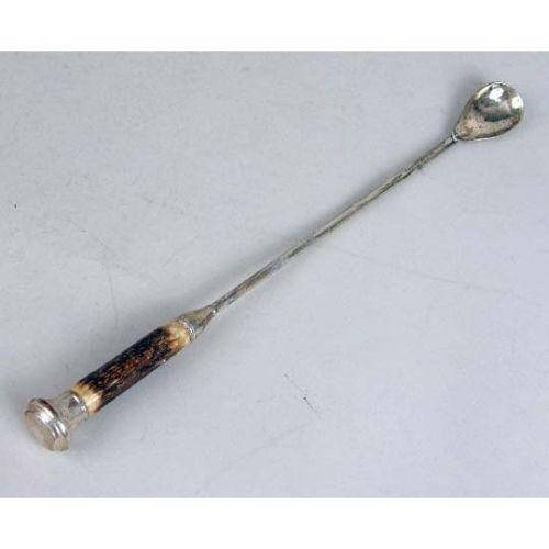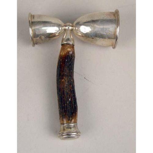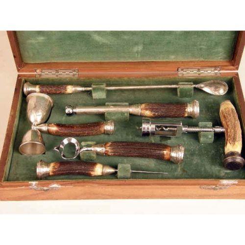 A BOXED SET OF STERLING SILVER MOUNTED HORN-LIKE BAR ITEMS<BR><BR>Including a double jigger, a stirring spoon, bottle and can openers in a fitted hinged wooden case