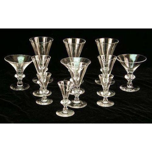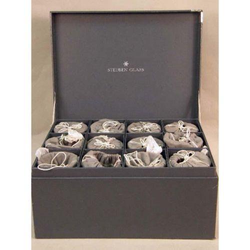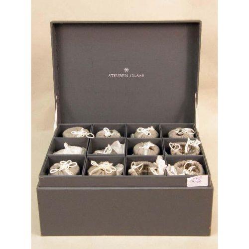 A BOXED SET OF STEUBEN CRYSTAL STEMWARE SERVICE<BR><BR>Including, twelve each, water goblets, wine glasses, cordials, and champagne saucers