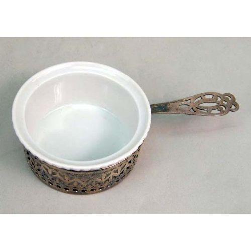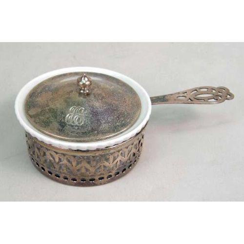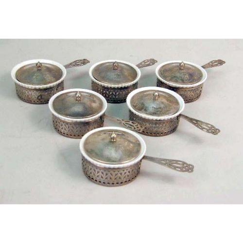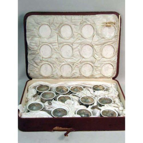 A BOXED SET OF TWELVE STERLING SILVER MONOGRAMMED RAMEKIN HOLDERS AND LIDS<BR><BR>with porcelain inserts.