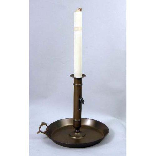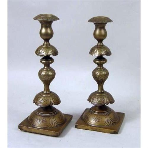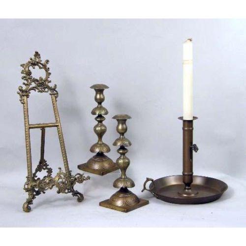 A BRASS CANDLESTICK OF IMPRESSIVE SIZE<BR><BR>Together with a pair of Indian brass candlesticks, and a brass table top easel, 4 pieces