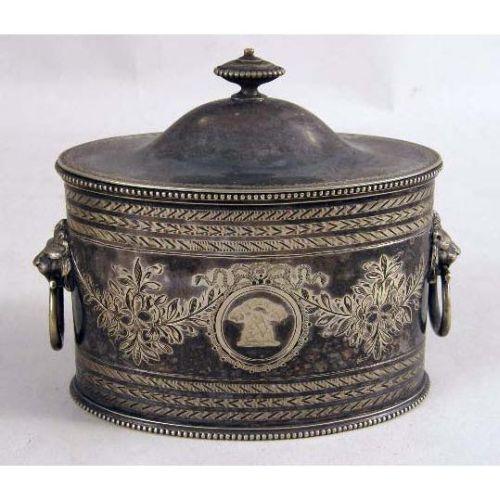 A BRASS INKWELL<BR><BR>With ball-form inkwell surmounted on top of eagle with outspread wings, 7"h x 5-1/2"dia. Together with a Victorian silver plated oval hinged box with lion mask handles, and engraved foliate drapery, 5"h x 5"l