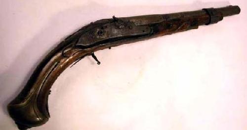 A BRASS MOUNTED WALNUT DUELING PISTOL; English, losses, "as found" condition, 20"l