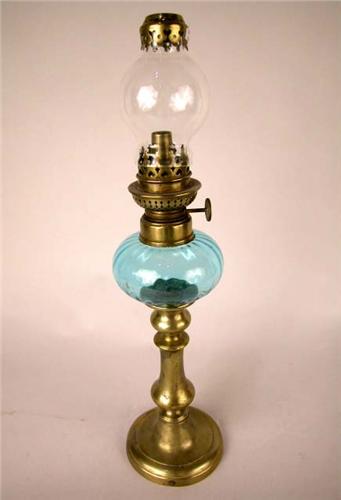 A BRASS OIL LAMP WITH BLUE GLASS, CONTINENTAL; Marked "W & W Cosmos" 13"h