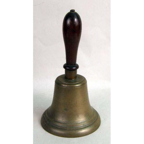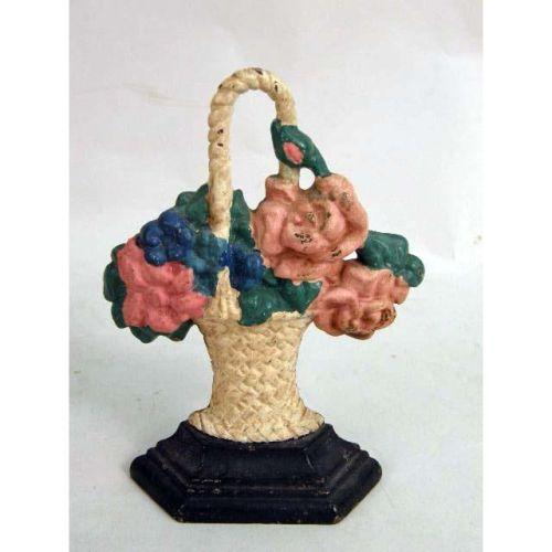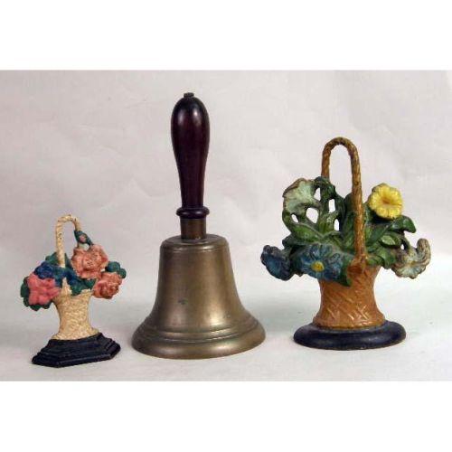 A BRASS SCHOOL BELL<BR><BR>Together with two painted cast-iron flower basket door stops. 3 pieces