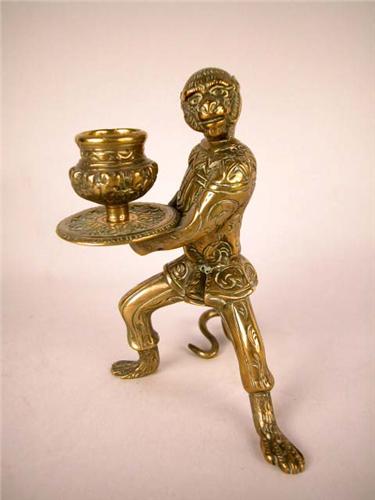 A BRASS SINGLE CANDLESTICK, FRENCH; of a figural monkey 6"h