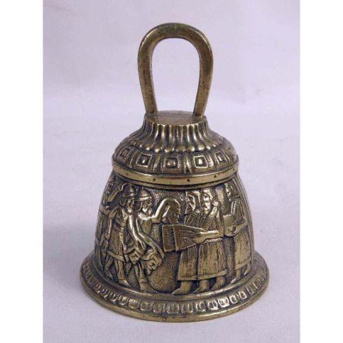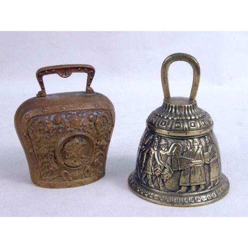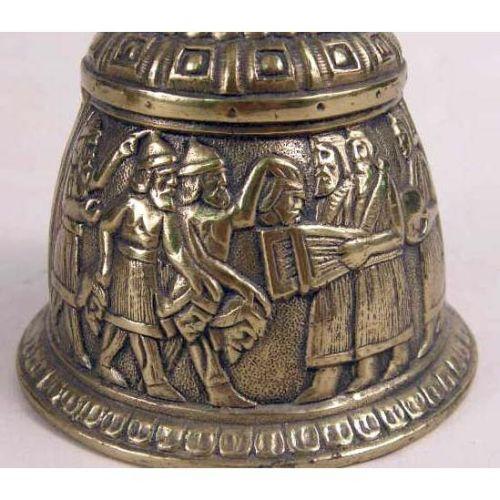 A BRONZE BELL DEPICTING MAXIMILIAN, EMPEROR OF AUSTRIA<BR><BR>together with a brass bell depicting a Babylonian scene of warfare and carnage. Heights from 4 1/2" - 5 1/2". 2 pieces.