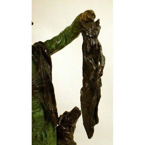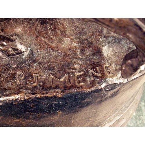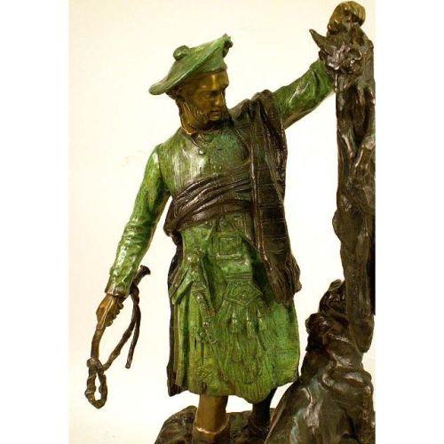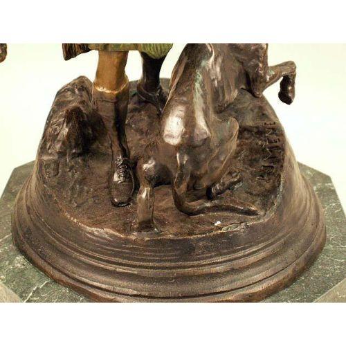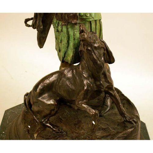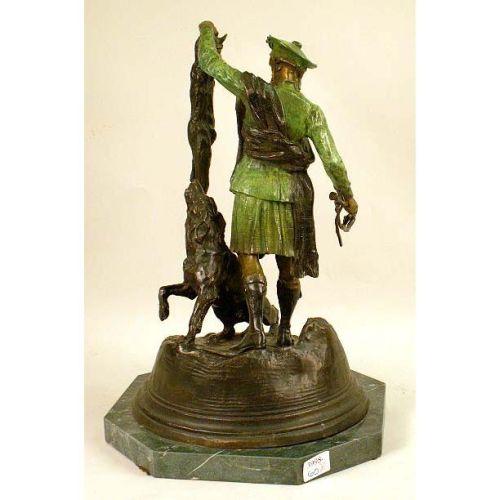 A BRONZE FIGURAL GROUP<BR><BR>Depicting a Scottish Highlander holding a fox with a hound by his side, base inscribed "P.J. Mene," fitted on a marble base, 20 1/2"h x 13"w
