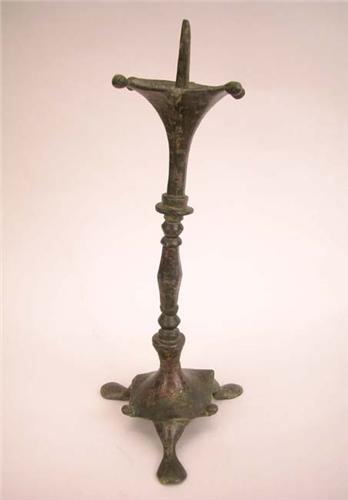 A BRONZE GOTHIC CANDLESTICK, CONTINENTAL; with a pricket spike and drip pan, base has three padded feet 10 1/2"h