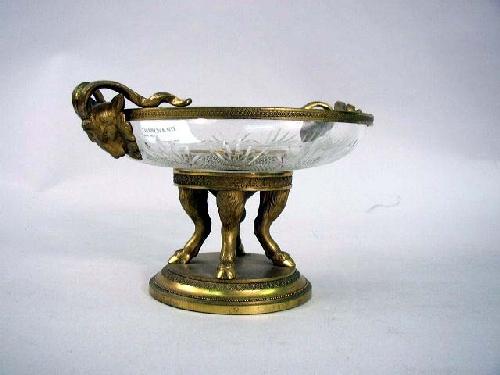 A BRONZE RAM'S HEAD FOOTED COMPOTE; With colorless glass insert, 4"h