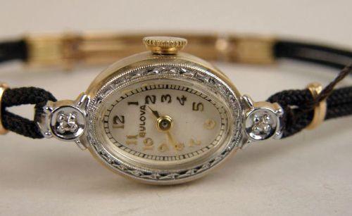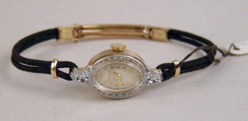 Set with two small diamonds, black cord band, in working order, new old stock, with original box.