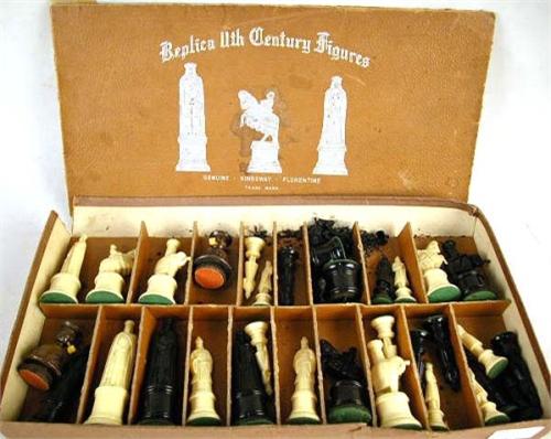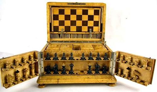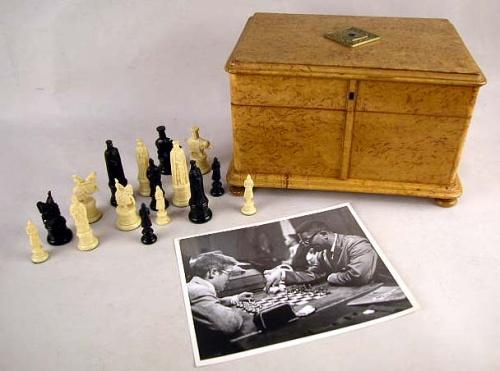 A BURL-WOOD CHESS, CHECKER, AND GAME SET Probably English, losses. together with a black and white photo of Dizzy playing chess and a partial set of chess figures, losses