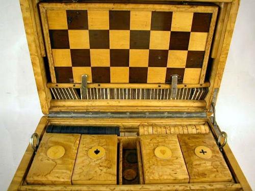A BURL-WOOD CHESS, CHECKER, AND GAME SET Probably English, losses. together with a black and white p