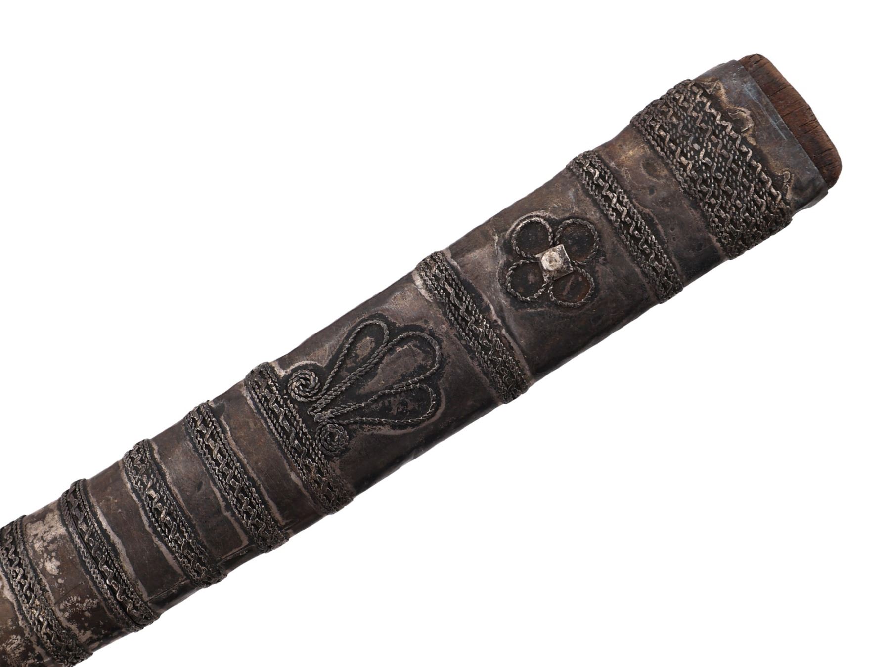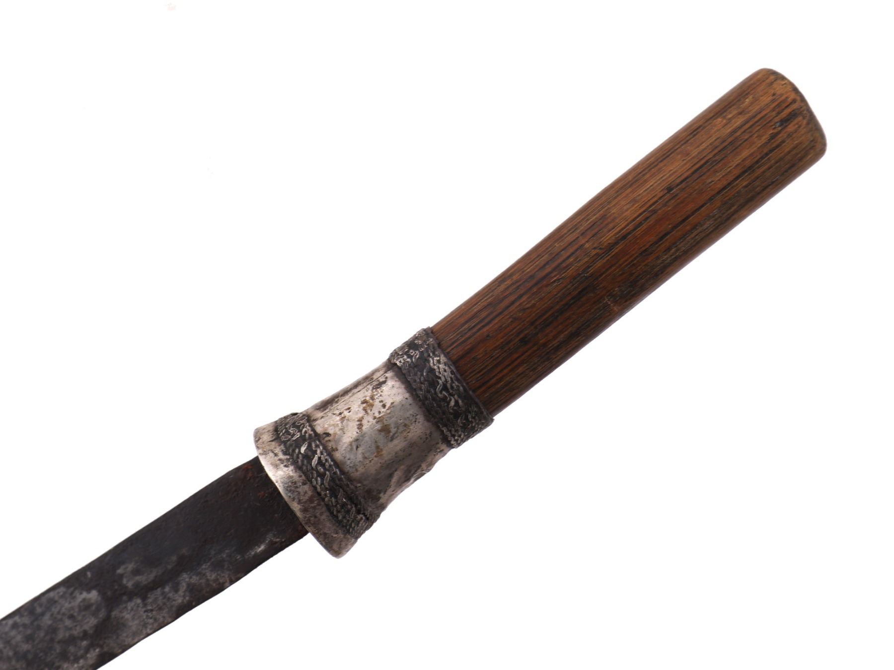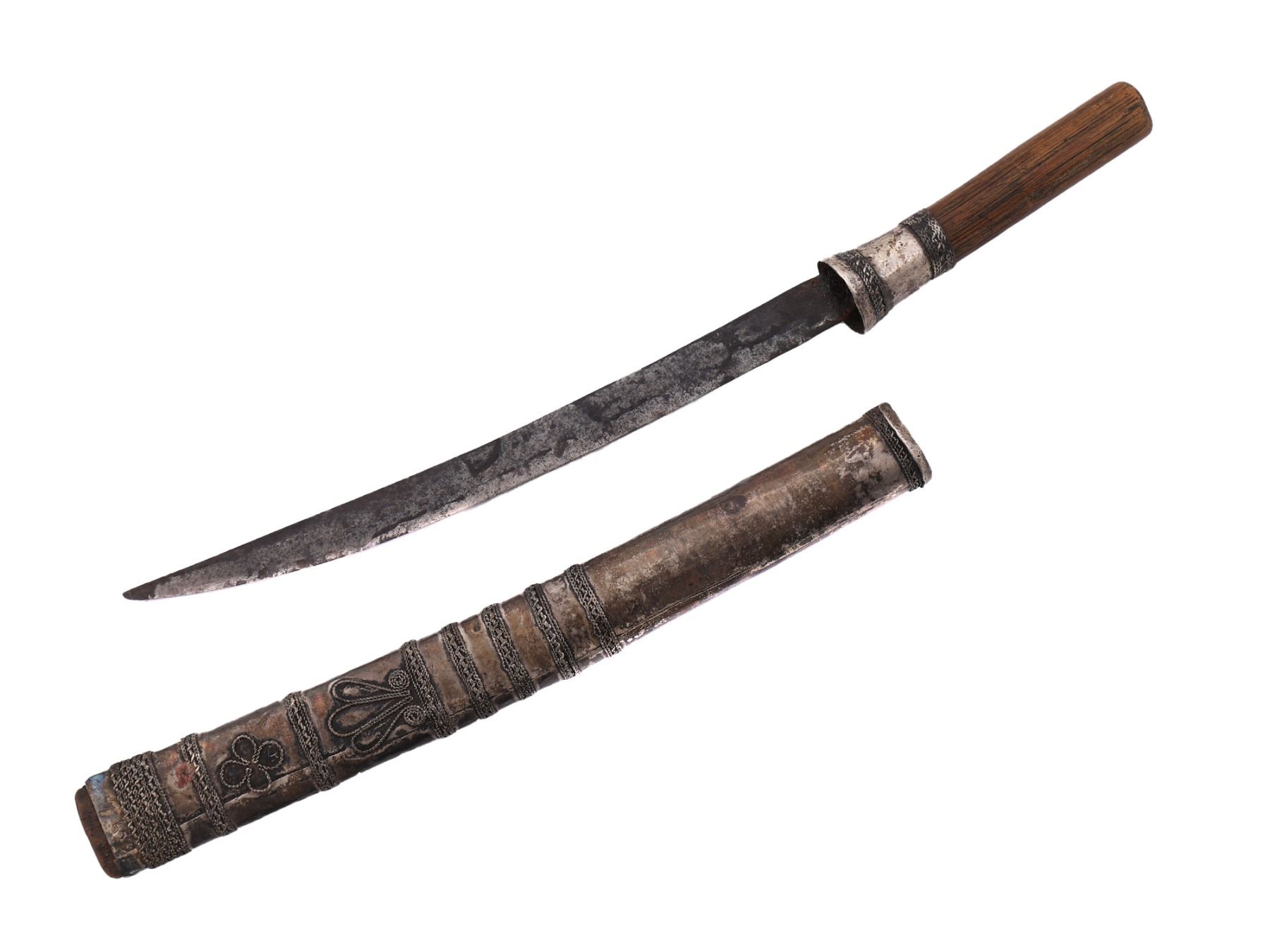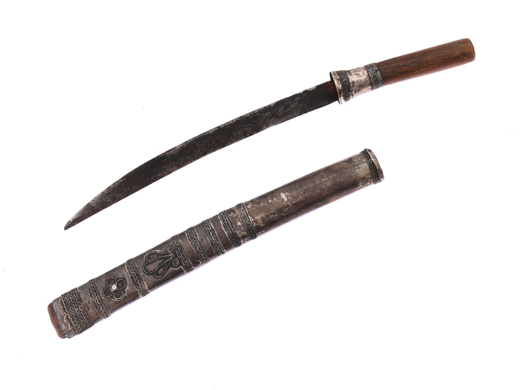 A silver-mounted Burmese Dha sword with a slightly curved single-edged blade, wood hilt with silver ferrule and wood scabbard silver covered and decorated with filigree work.