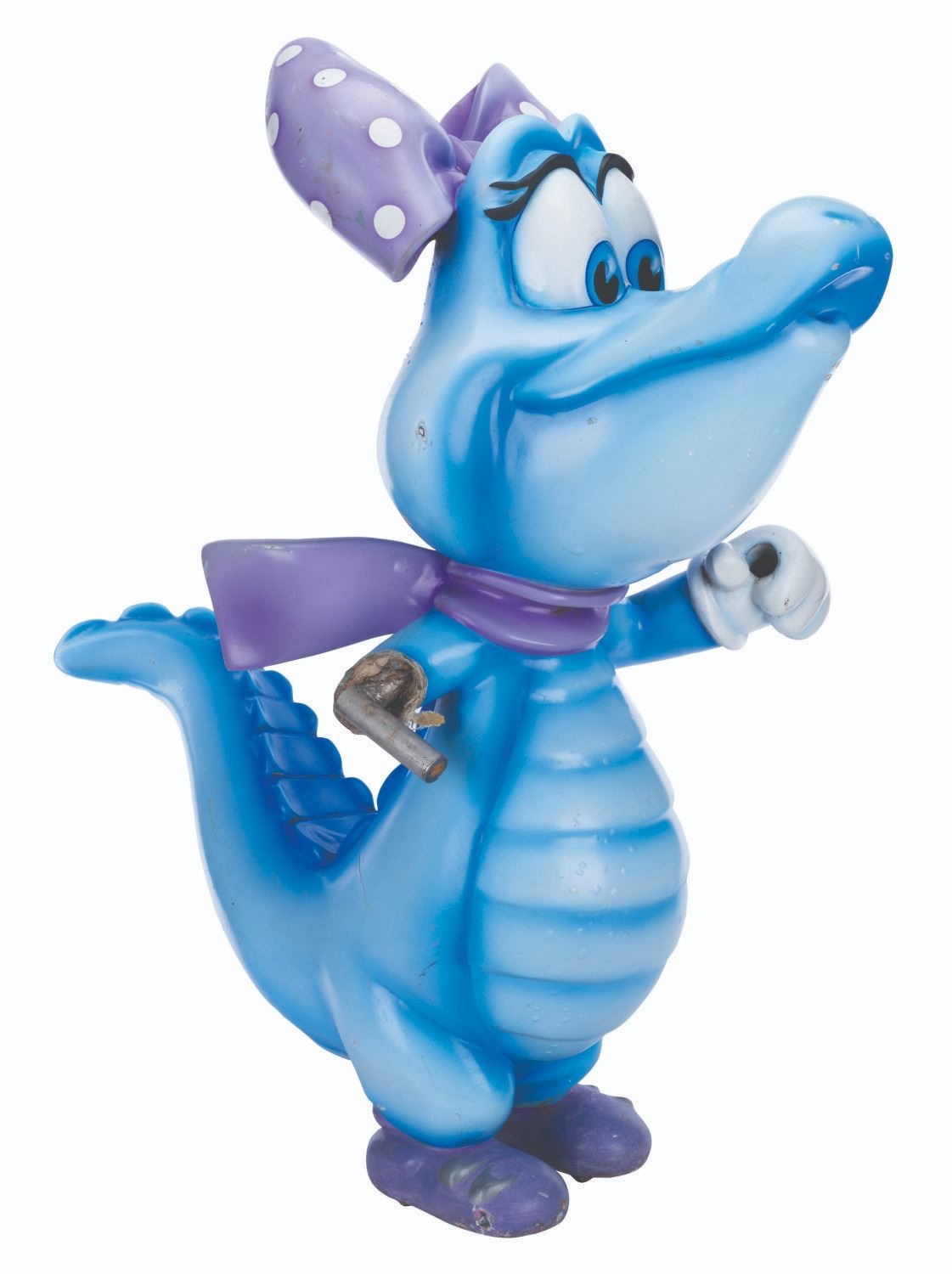 (Walt Disney World, 1995) A fiberglass baby gator wearing a bow from the Tike’s Peak wading pool at Disney’s Blizzard Beach. Measuring 39" x 39.5", the baby gator is in fair condition with cracks, including a horizontal crack across the entire back, stains, paint chips, a missing right hand with metal exposure, and wear from use.