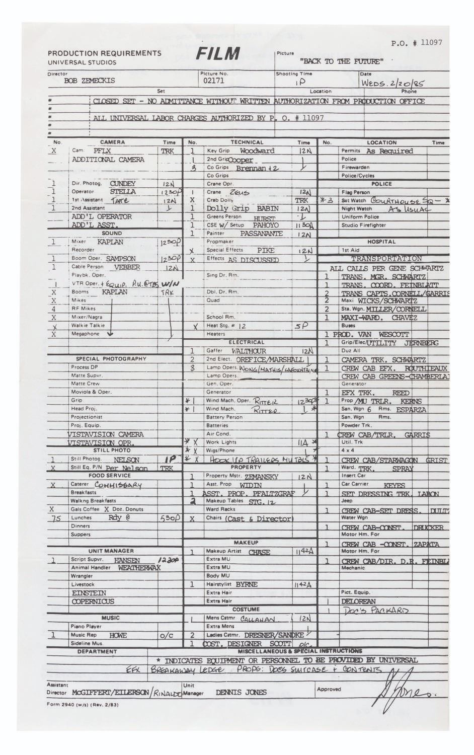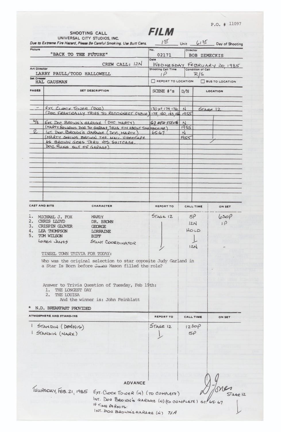 (Universal, 1985) An original "Back to the Future" production used call sheet dated March 1, 1985 (the 67th day of shooting). Call sheets provide important logistical information to the cast and crew for a single day of shooting. The double-sided paper measures 8.5" x 14", and is in fine condition.