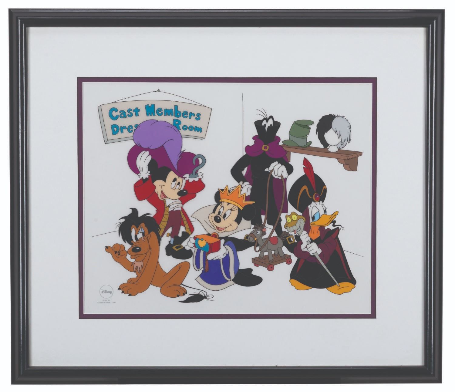 (Disneyana, 1997) A Disneyana Convention"Backstage With the Fabulous Five" limited edition sericel featuring Mickey and friends dressed as Disney Villains. Released in an unnumbered edition of 1500, the piece measures 22.5" x 19.5" framed, with a character image size of 15" x 12". The sericel is in fine condition with very light wear to the frame from display.