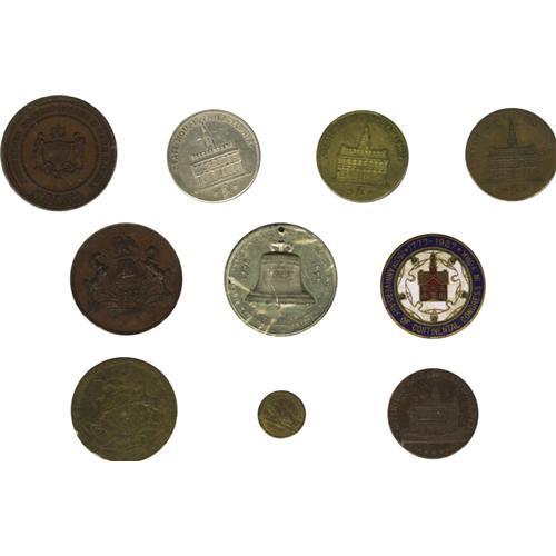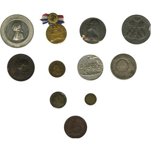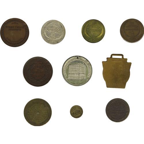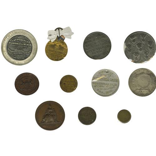 <B>A Balance of Collections - Medals Mostly From Pennsylvania.</B></I> Included are: Aug. Sage Historical Series No. 4, Carpenter's Hall (copper, UNC); Aug. Sage Historical Series No. 6, Independence Hall (copper, AU, brass, UNC, silvered copper, AU); Journeyman Confectioners and Cake Bakers Beneficial Association, unissued bronze prize medal (UNC); enameled fob both anniversary of Centennial Congress, 1717-1917 (VF); Old Fellows Temple, Philadelphia / Liberty Bell, 1885 (white metal, AU, holed); Pennsylvania State Fair, Philadelphia, 1885 (bronze, UNC); Philadelphia Exposition, 1897, Expo buildings, Liberty Bell (Bronze, UNC); Pa. 1855 brass perpetual calendar (VF); First Methodist Conference Philadelphia, 1773 Centennial, 1866 (white metal, AU); Pa. Humane Society founded 1887 (bronze, AU); Constitutional Centennial (bronze, VF); International Expo 1877, struck by U.S. Mint (bronze, VG); Constitutional Sesqui-centennial brass medal suspended from Liberty Bell pinback and red, white, and blue ribbon (AU); Columbian Expo (HK 158) (VF, holed); Louis 16th and Marie Antoinette, 1778, (bronze, XF); Betts S16 (William Pitt) (Lead copy); Betts 425, British Commander 7 years war 1759 (lead copy); Betts 95, 1702 America's Treasure Captured at Vigo, (brass, FINE). 20 pieces.