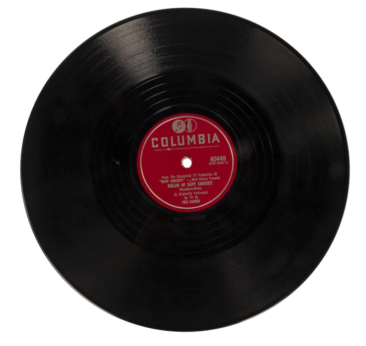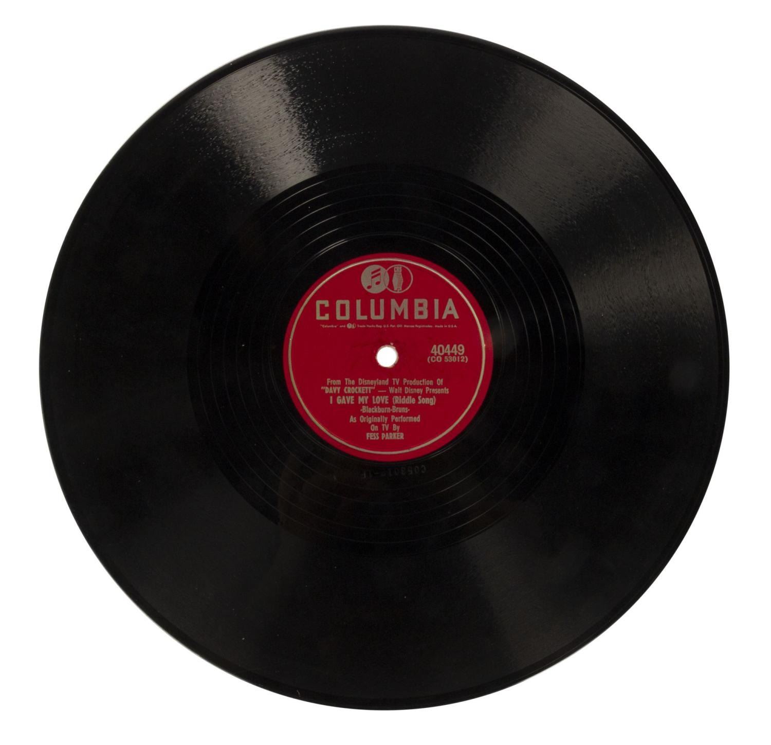 (Columbia, 1955) An original 78rpm Walt Disney's "Davy Crockett" record. Side A features the iconic track "Ballad of Davy Crockett," and Side B includes "I Gave My Love." Both songs were originally performed by Fess Parker in his role as Davy. The 10" record is in very good condition with some expected minor wear from light use.