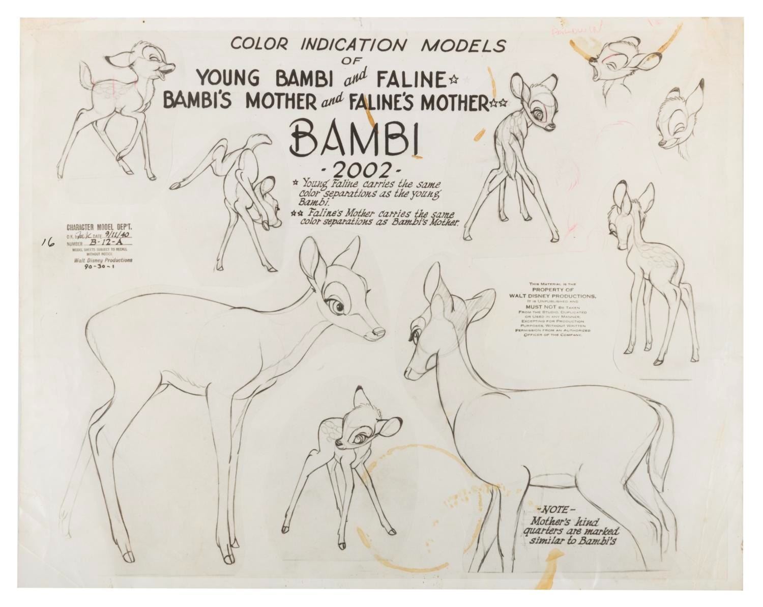 (Disney, 1942) A Studio-produced photostat color indication model sheet for Walt Disney’s"Bambi." Model sheets like this were distributed to animators on a film to ensure everyone drew the character consistently. Measuring 11" x 14", the photostat model sheet is in fair condition with heavy stains, creases, folds, pinholes, and wear from production use.
