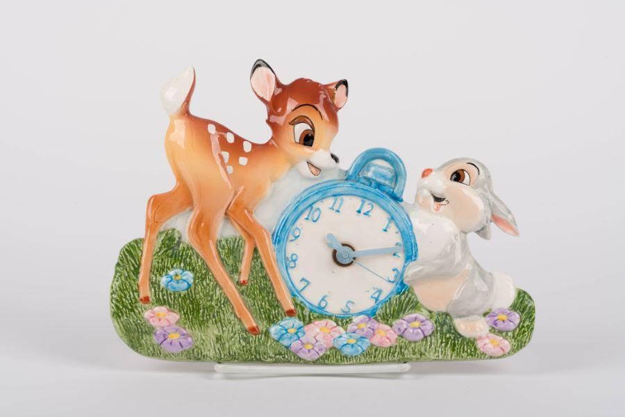 (Schmid, 1992) A ceramic clock featuring Bambi and Thumper in a flowering meadow. The clock operates with one"AA" battery (not included), and functioned when tested. Measuring 8" x 11.25", the clock is in good condition with light wear from age, including slight paint chipping.
