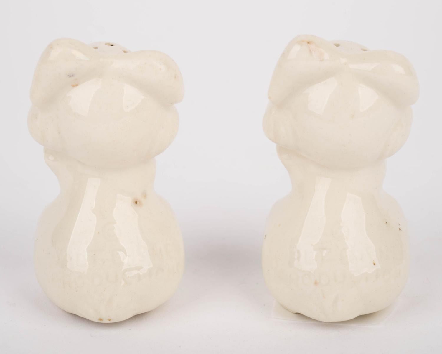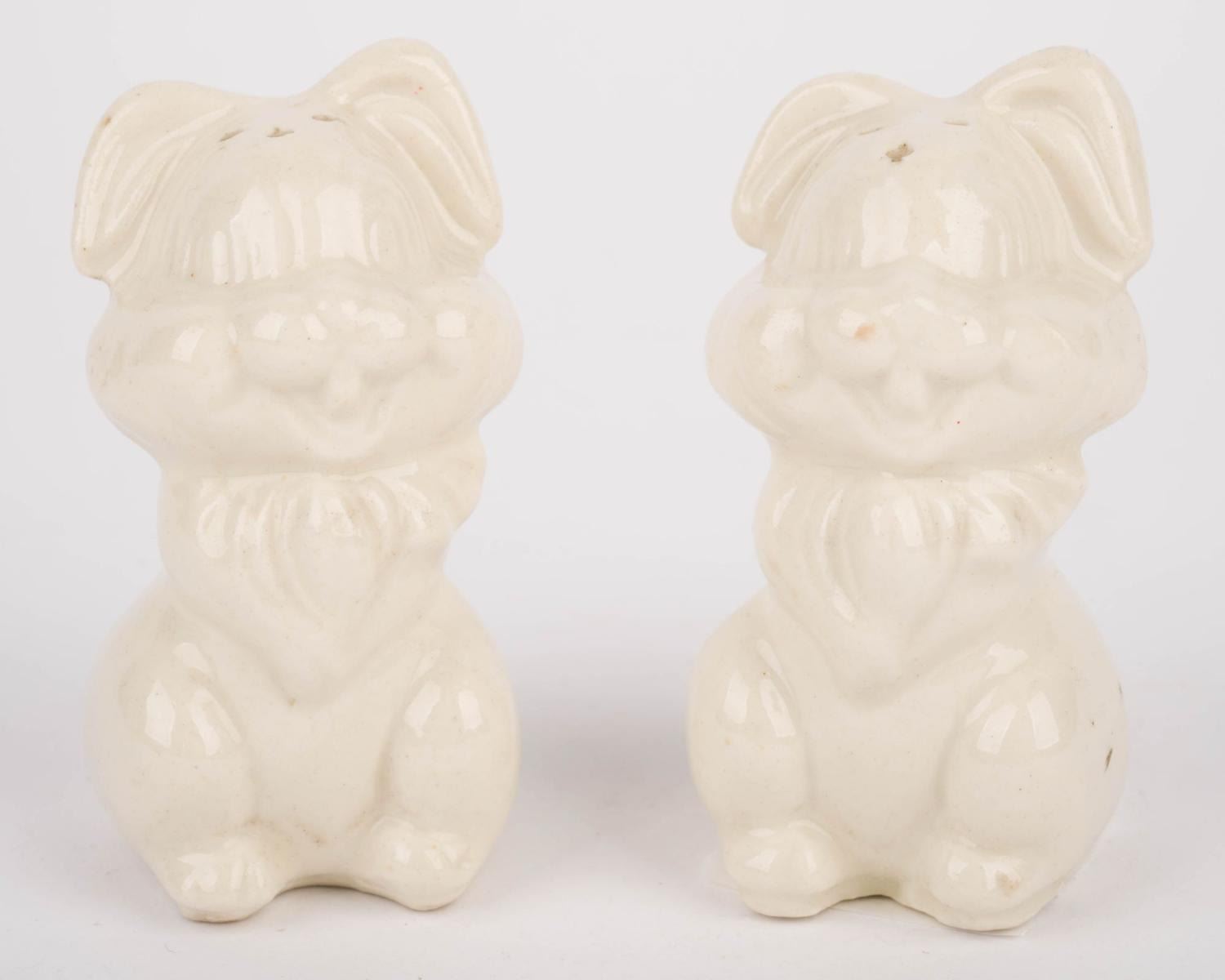 (Leeds China, 1940s-50s) A set of ceramic salt and pepper shakers of Thumper from "Bambi." Measuring 1.75" x 1.75" and 3.25" tall each, the shakers are in good condition with handling wear near the holes. One shaker has a small chip on the reverse, one stopper is missing, and the other stopper is stuck inside.