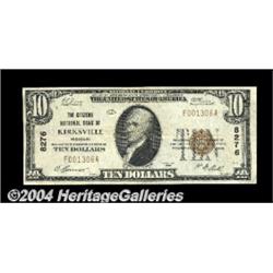 A Bank Type Set of Kirksville 1929 Issuers Kirksville, MO - $20 1929 Ty. 1 NB of Kirksville Ch.#5107 FineKirksville, MO - $10 1929 Ty. 1 Citizens NB Ch.#8276 VF. 2 notes <BR><BR><B>Important notice:</B> Heritage usually auctions material at the rate of 200-250 lots per hour. On some occasions eBay Live bid software or the Internet may not be able to keep up with the pace of the auction. We recommend placing a realistic absentee bid now as insurance to avoid disappointment. Occasionally the auctioneer may eliminate or reject an eBay Live bid, and the auctioneer may also reopen a lot after the close of the eBay live bidding (usually because we missed an audience bid), and may reject your bid even if it shows you as the winning bidder. By bidding via eBay Live, you agree that Heritage may award the lot to another bidder at its sole discretion under the circumstances described above or any other reasonable circumstances. Since eBay bids are not shown to us until we open the lot on the floor, we treat those bids just like floor bids. In most cases the floor responds before the eBay bid is presented to us, due to Internet lag time, so for consistency we have made it a policy that floor bids are always considered first over tie eBay live bids. Also please note that all Heritage lots purchased through eBay Live carry a 20% Buyer's Premium. Please make sure you read the Terms and Conditions before you bid. <BR><BR><B>IMPORTANT ANNOUNCEMENT ABOUT RESERVES:</B> Heritage now divulges all reserves on its web site 7 days before every auction. If you want to know whether the reserve on this lot has been met, and if not, what the reserve amount is, please visit this lot page on the HeritageCoin.com web site, or email: bid@HeritageGalleries.com
