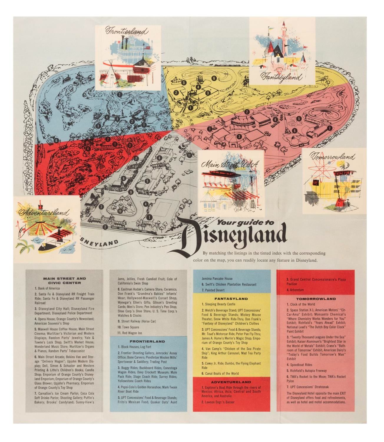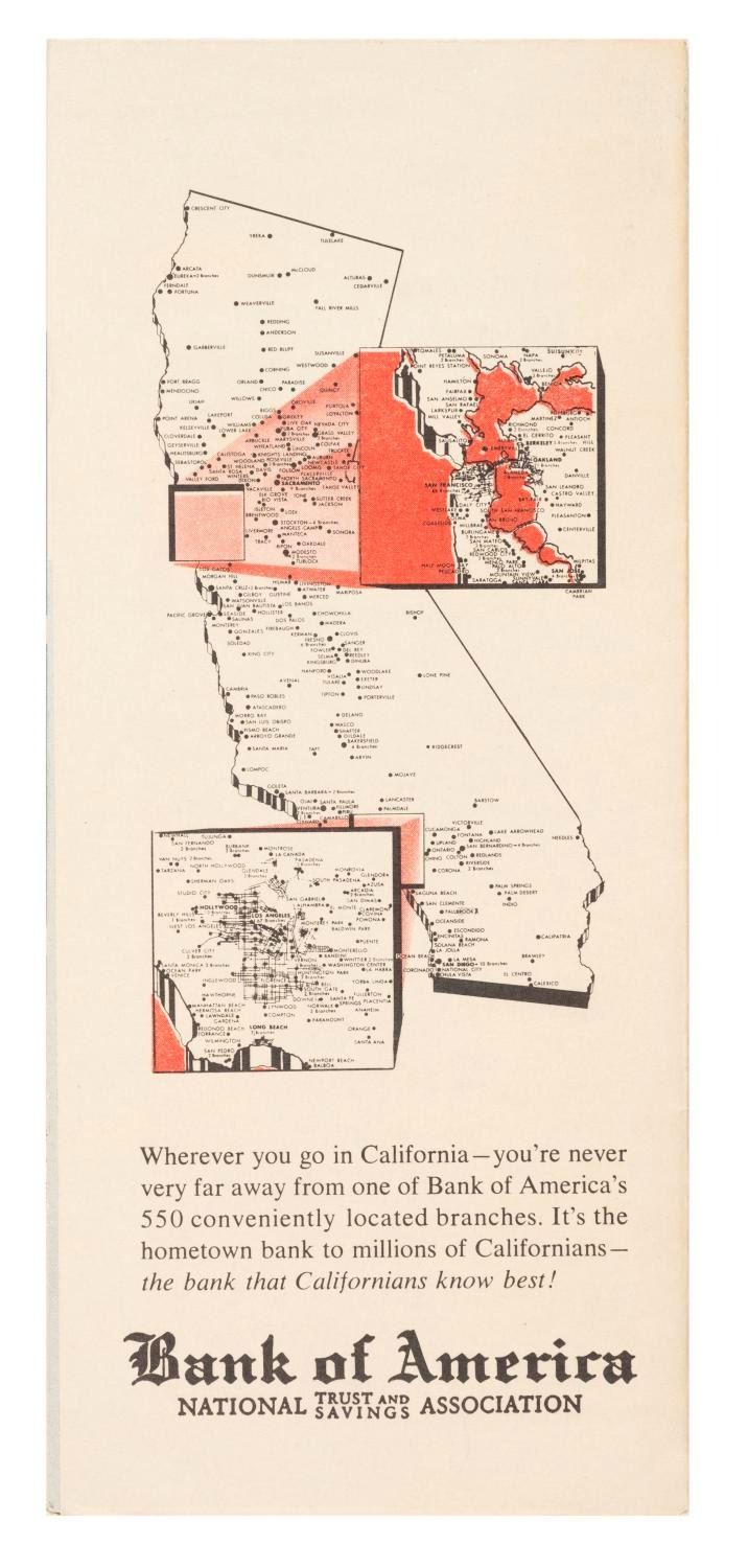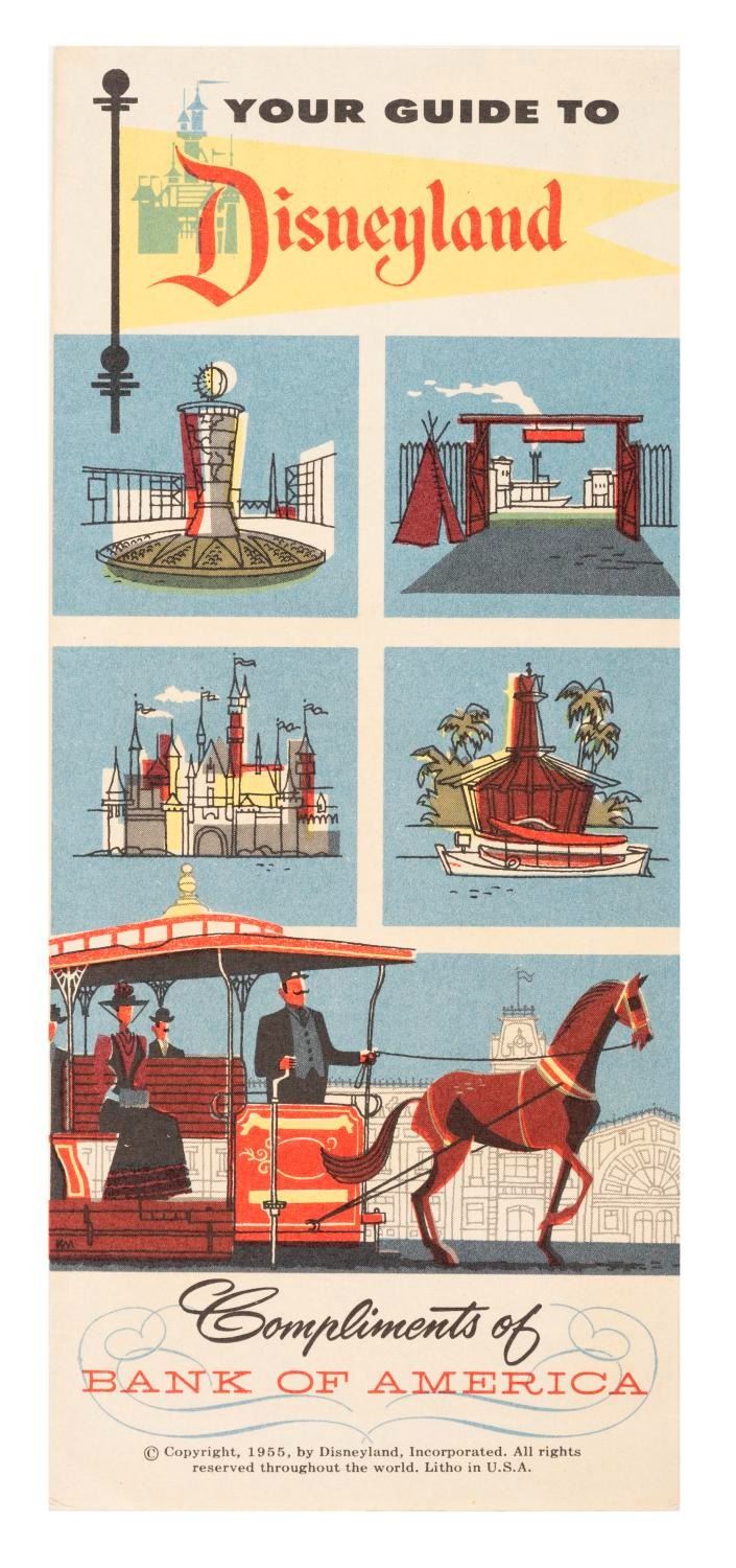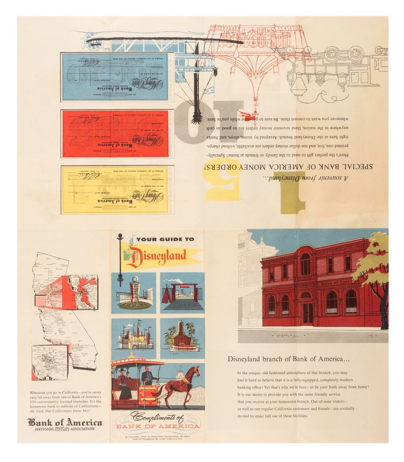 (Disneyland, 1955) An extremely rare brochure from Disneyland's Bank of America branch on Main Street with illustrations depicting the different lands of the Park on the cover, and a fold-out map of Disneyland with information on Bank of America money orders. Measuring 8" x 3.5", the brochure is in very good condition with minor discoloration.