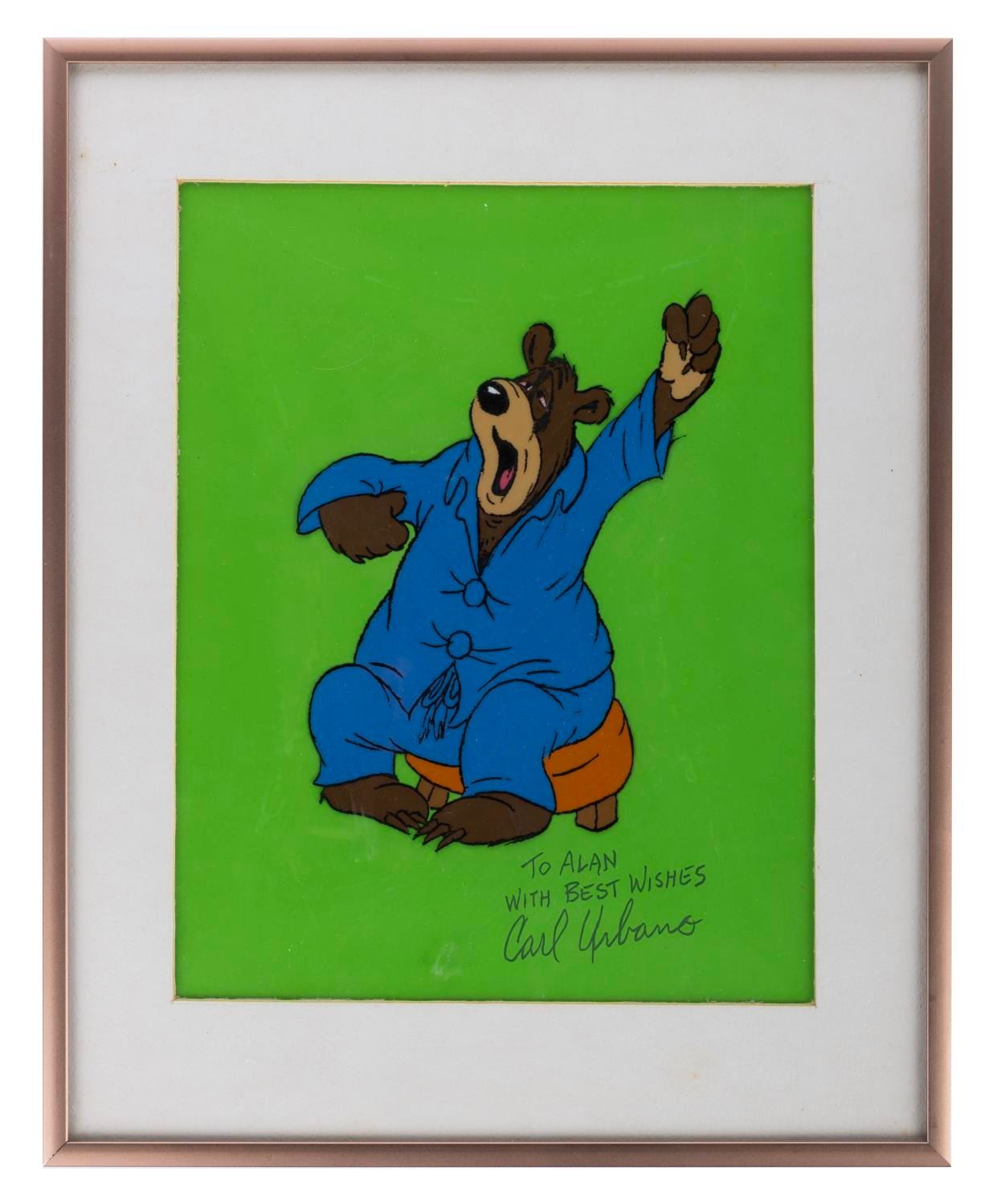 (Urbano) A cel of Barney the Bear signed by animator Carl Urbano. Barney's first appearance in "The Bear That Couldn't Sleep" had Urbano on the animation team. This cel approximates that appearance but was created much later. With a character image size of 4.75" x 6.25", the cel with autograph is in fine condition, within its 9.5" x 12" mat.