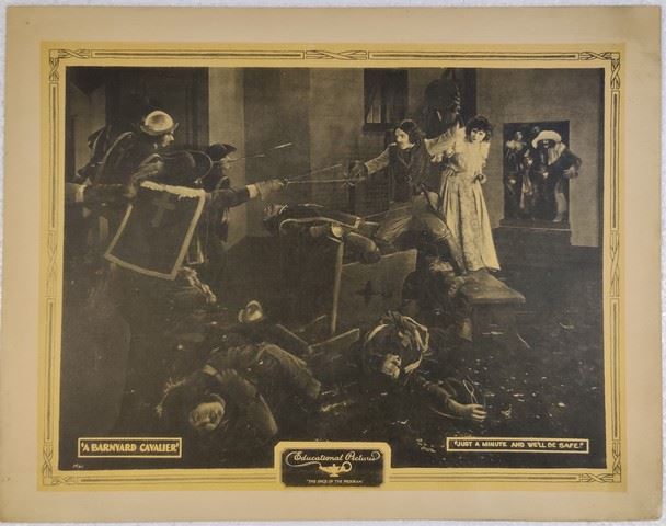 A Barnyard Cavalier (Educational Pictures, 1922) lobby card. Comedy, Short. Starring Bobby Vernon, Viora Daniel. Directed by Al Christie. Minor edge wear, minor creases, pin-holes, drawings on back. Good. (11"x14").