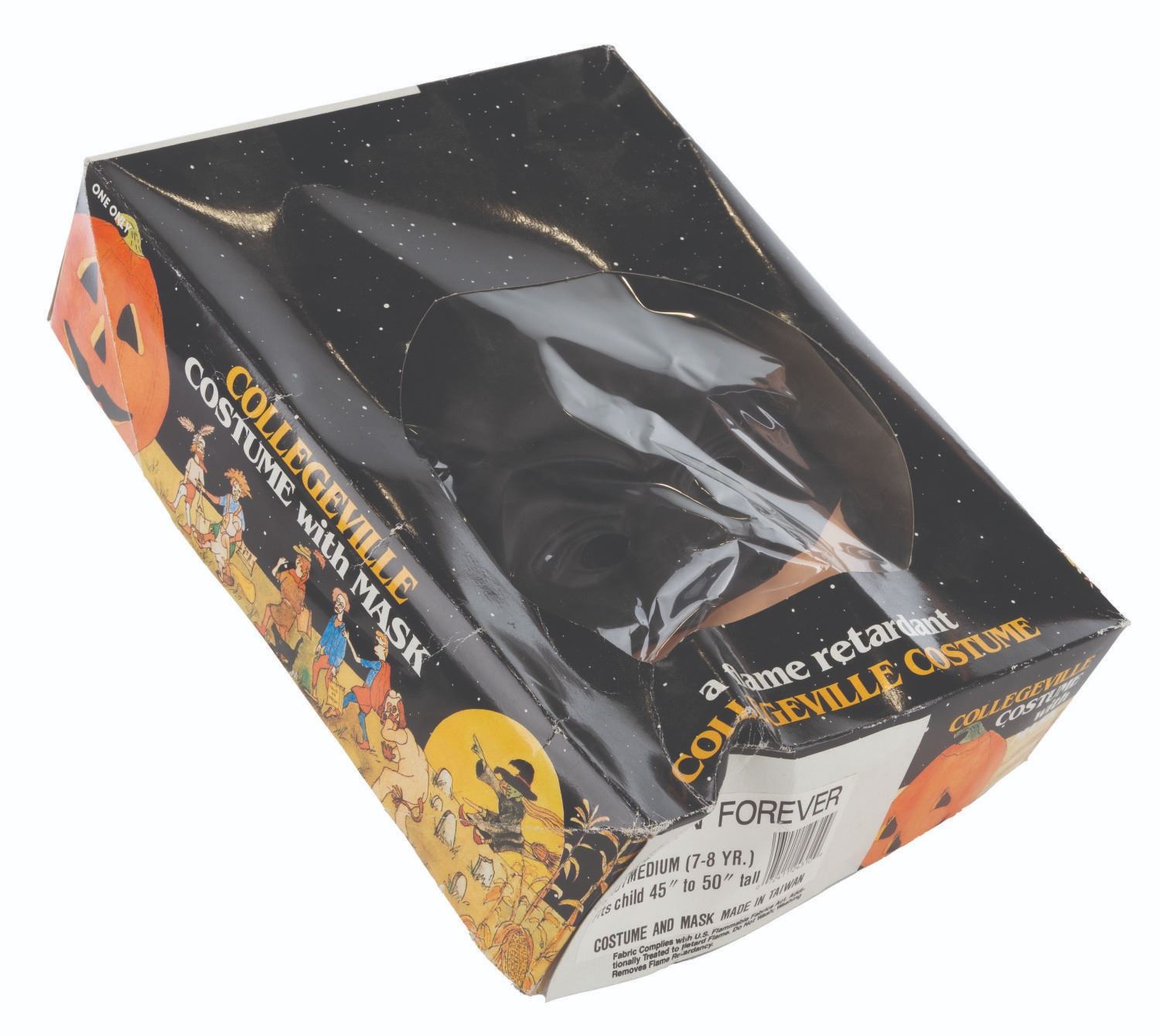 (Collegeville Costumes, 1995) A "Batman Forever" Halloween Costume with the original box. Labeled a child size medium (7-8 yr.), the costume is in fine, unused condition. The mask is in very good condition with two splits in the left side from age and creased ears from storage. The box is in fair condition with heavy creases mainly to the bottom edge.