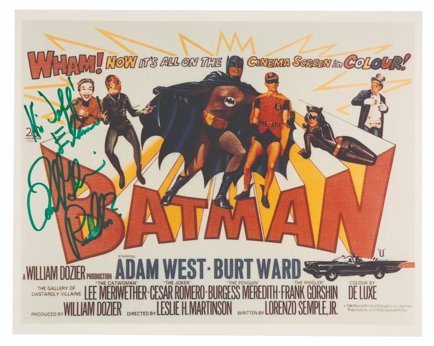 (20th Century Fox, 1990s-2000s) A printed European lobby card for "Batman: The Movie,” signed in green ink by Frank Gorshin. Measuring 8” x 10”, the low-resolution print is in very good condition with light scratches.