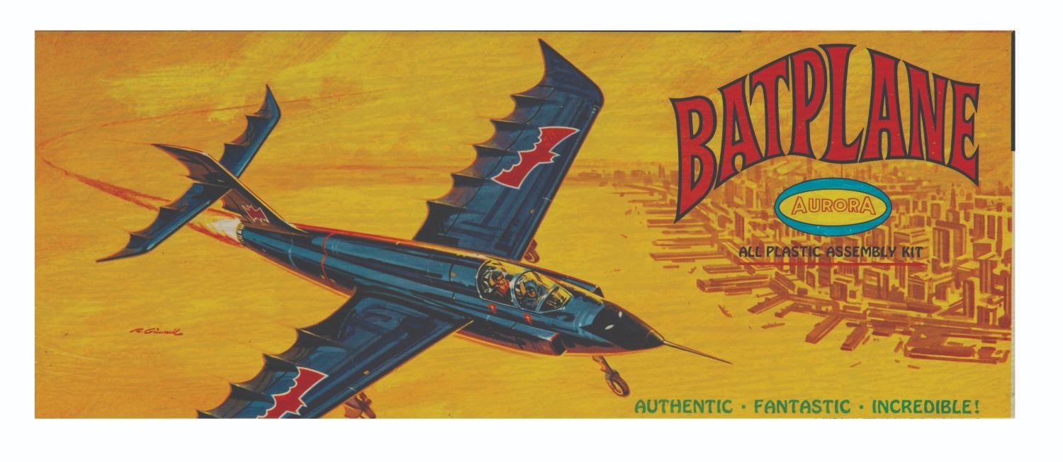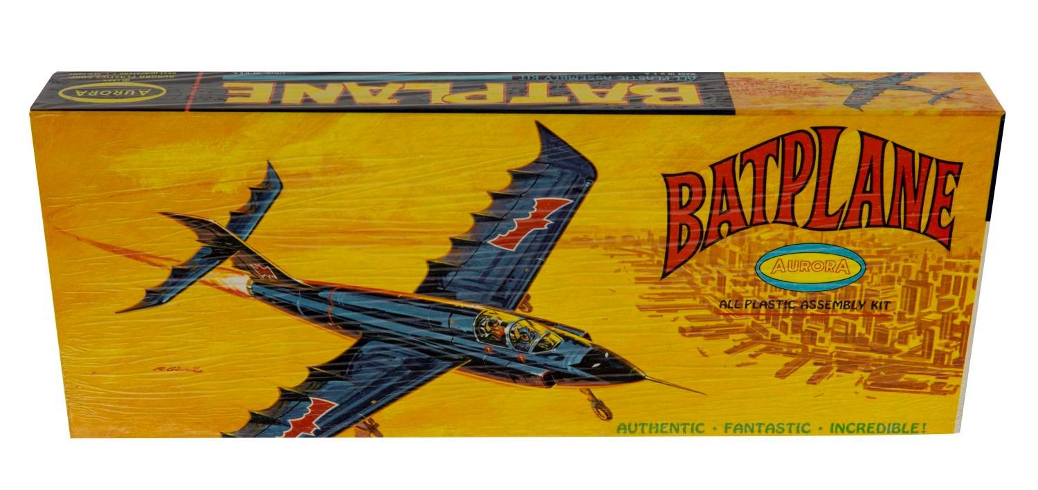(Aurora, 1966) A factory-sealed model kit of the Batplane. Capitalizing on the popularity of the live-action series, the box art of Batman and Robin closely resembles Adam West and Burt Ward. While the Caped Crusader has utilized several aerial vehicles over the years, this design most closely resembles the Batplane II that was introduced in Batman #61 (Oct 1950) and appeared in this form through the mid-60s. Measuring 5.25" x 13" and 1.5" deep, the item is tightly wrapped in its original cellophane and in very fine condition, with only the slightest residue from a price sticker on the side panel. Labeled Aurora Kit No. 487-100.