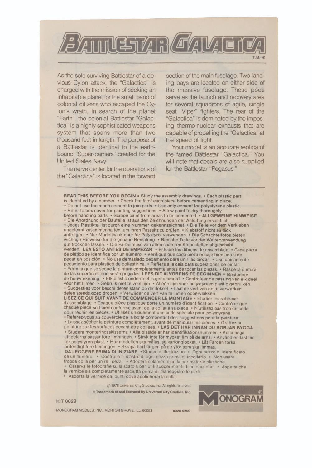 (Monogram, 1978) A plastic model kit based on the original “Battlestar Galactica” Apogee Effects spaceship filming miniature. Molded in silver plastic, the 1/4169 scale model appears to be complete, with some pieces still attached to the original sprues, and an instruction sheet and decals present. The model is in very good condition with light wear, detached pieces, and two pieces glued in place. The 10.5” x 19” x 2.5” box displays in good condition with light water damage, creases, tears, and crushing.