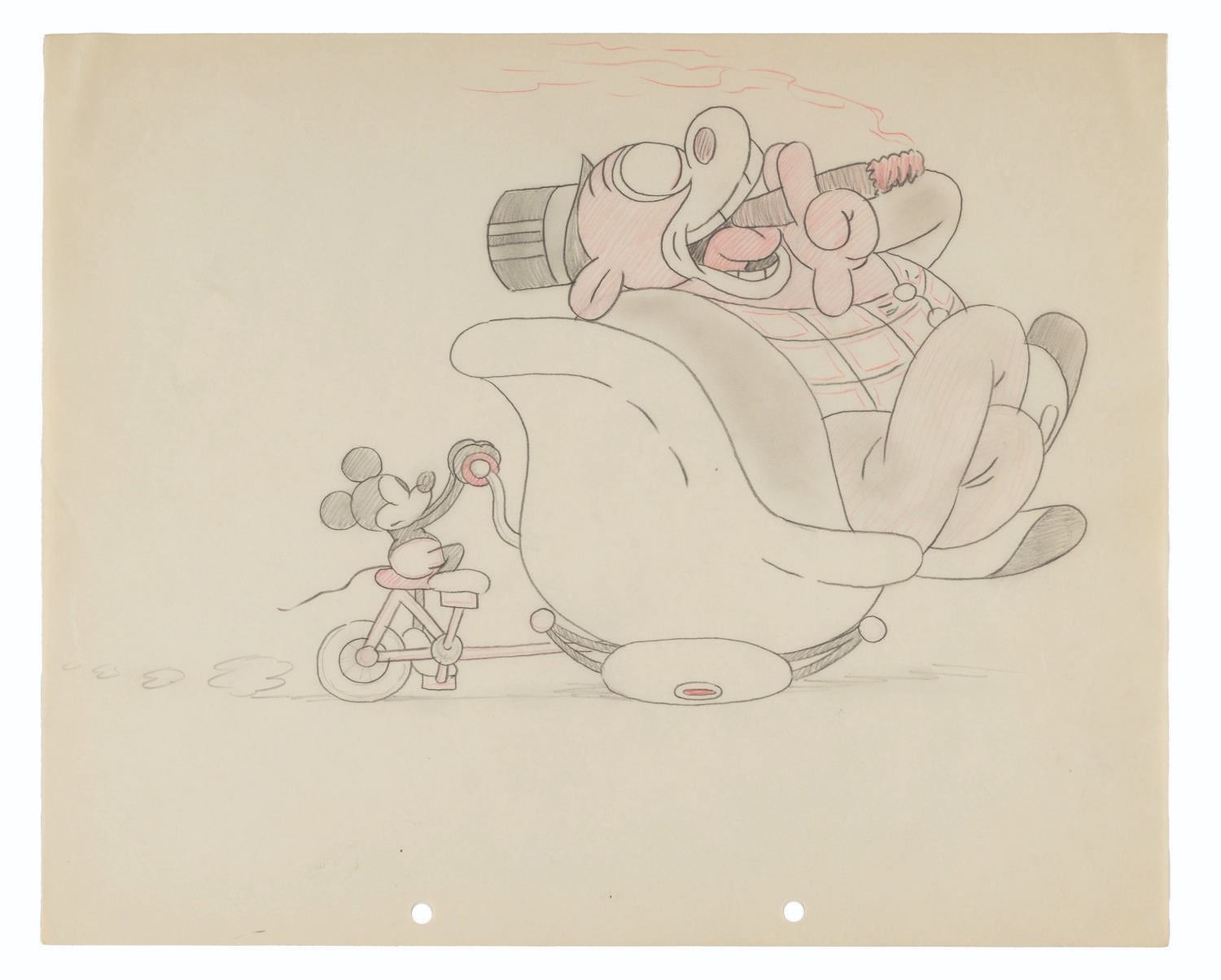 (Harman-Ising, 1932) An original storyboard drawing from the Looney Tunes short “Battling Bosko,” featuring a character with a striking resemblance to Mickey Mouse. At the time, it was common for Mickey look-alikes to appear in non-Disney cartoons, either as homage, parody, or pure coincidence. Measuring 9.75” x 12” with an image size of 6.5” x 9”, the graphite and colored pencil drawing is in very good condition with light edge wear from production use and light discoloration from age.