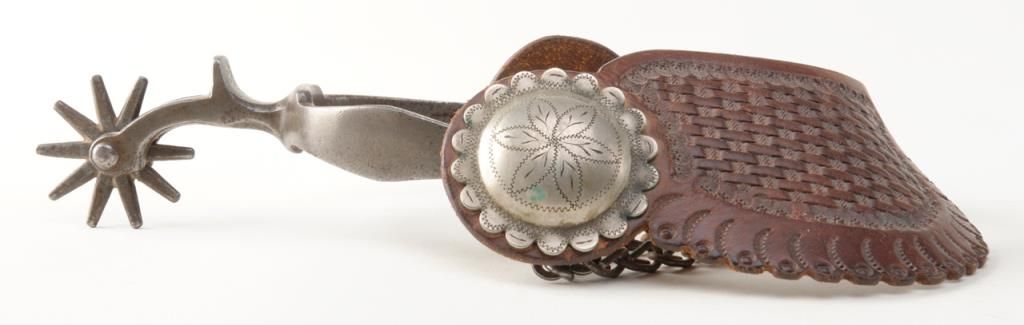 A.Bauermann Spurs with fancy engraved conchos and basket weaved leather straps in good condition from noted New Mexico collector. Est.: $300-$600