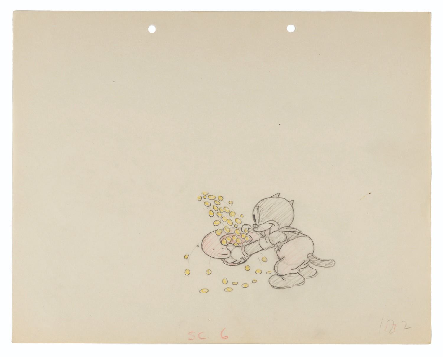 (Schlesinger, 1935) An original production drawing of Beans from the Looney Tunes Short “Gold Diggers of '49.” Accomplished in graphite and colored pencil with a character image size of 3” x 4”, the 9.5” x 12” drawing is in very good condition with light edge wear, a 0.25” stain toward the right center, and light discoloration from age.