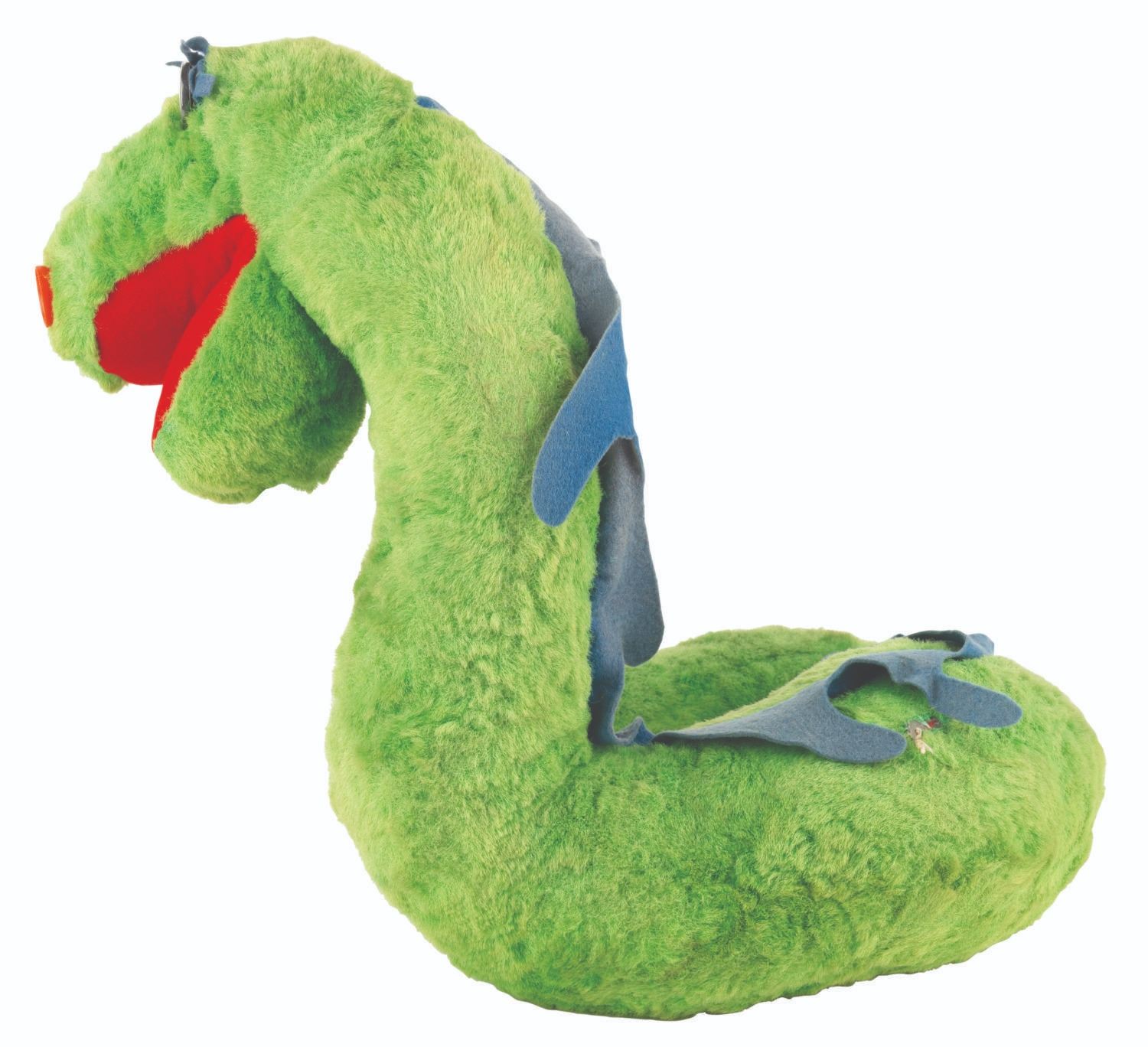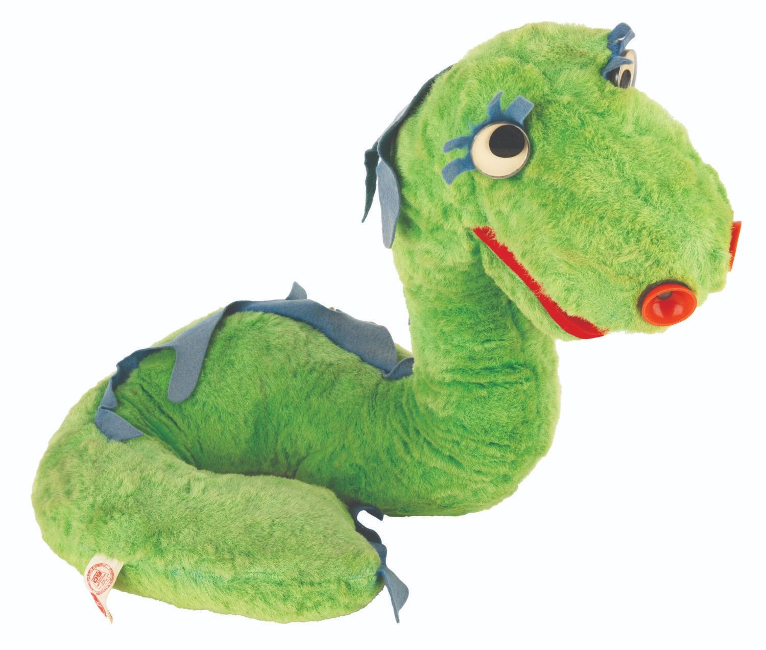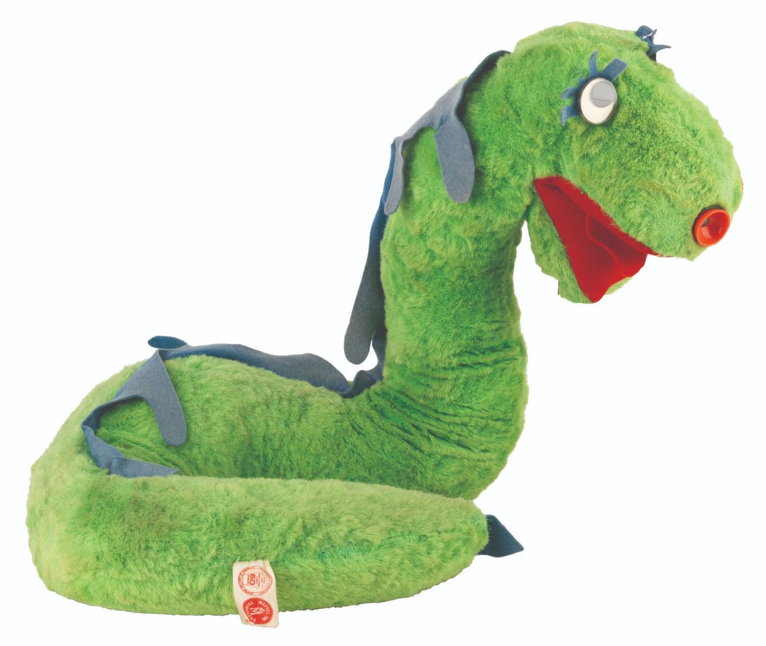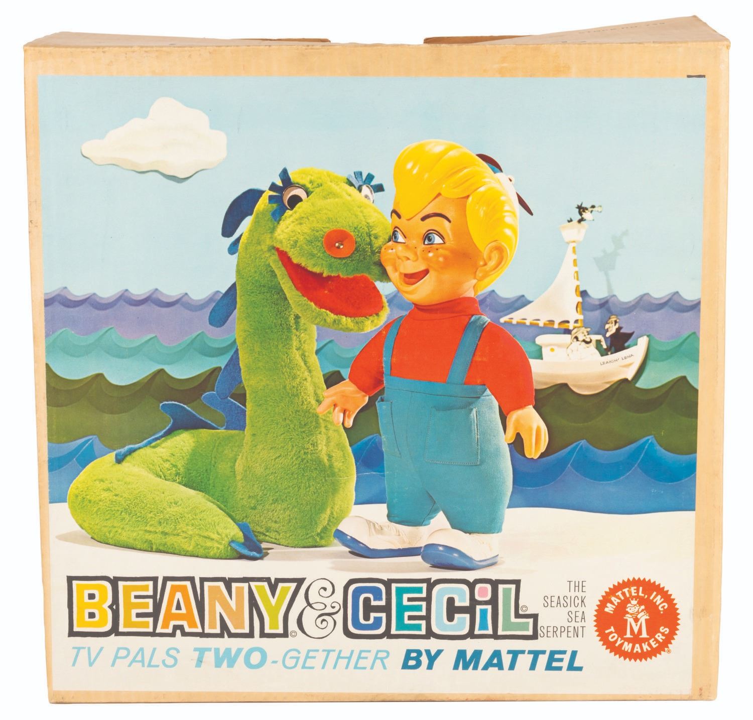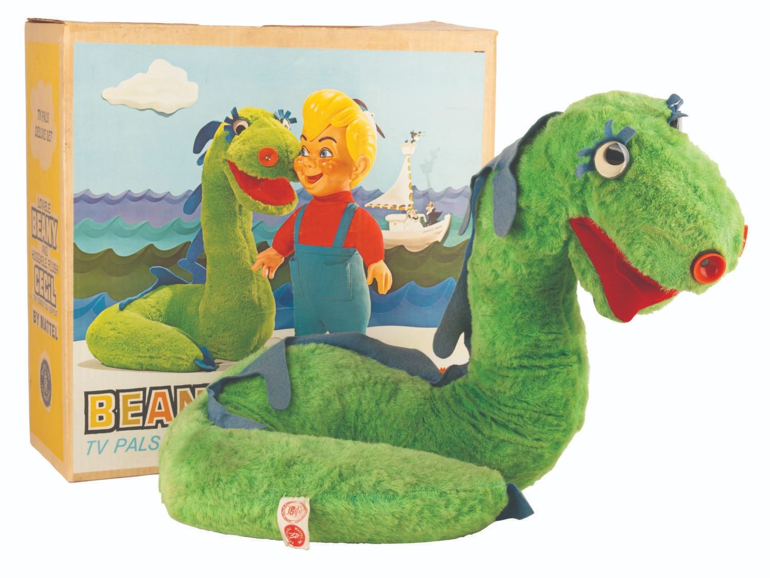 (Mattel, 1962) A Beany & Cecil TV Pals Two-Gether Cecil talking plush. When tested, the talking feature worked intermittently and quietly, and the plush does not stand upright. Measuring 15” x 12” x 16” tall with its 6” x 16” x 15.5” tall box, the plush and box are in good condition with stains and wear.