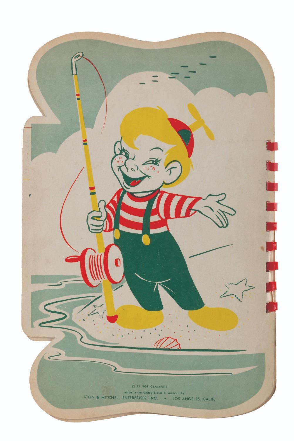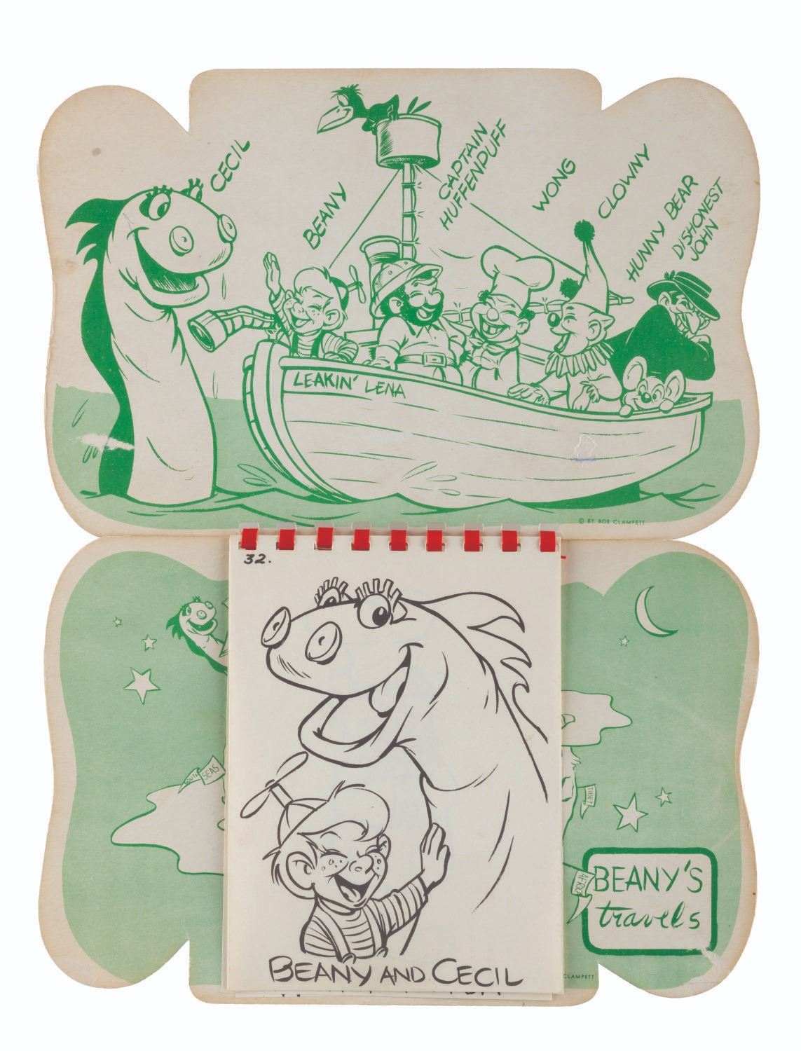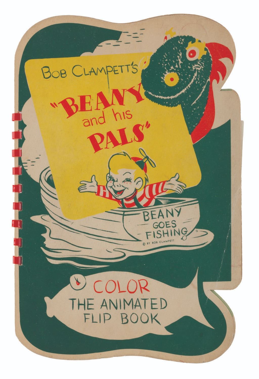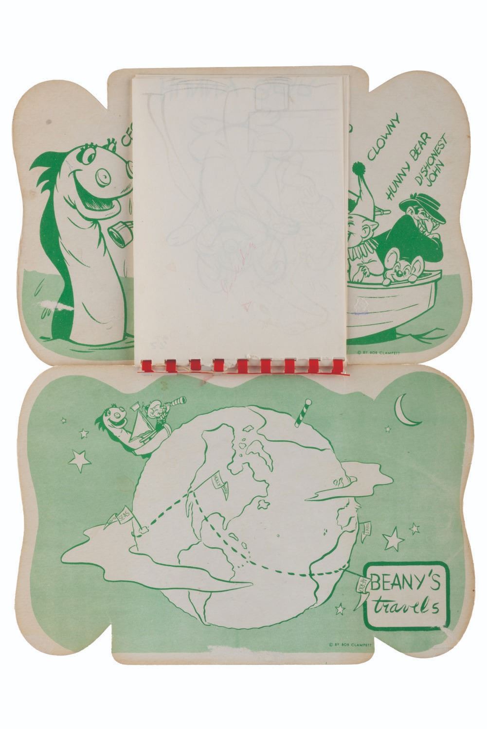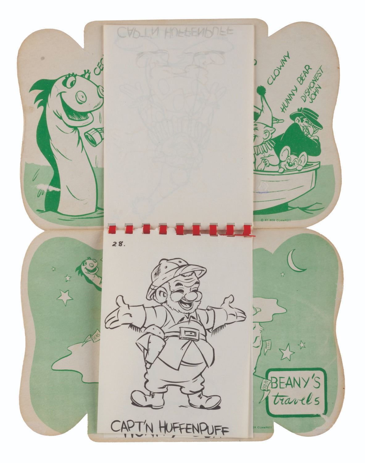 (1949-50s) A rare early “Beany and his Pals” coloring flip book. The spiral-bound booklet features six colorable pages of characters Beany and Cecil, Wong, Dishonest John, Clowny, Capt’n Huffenpuff, and Hunny Bear. Measuring 7” x 10.75” overall with 5” x 7” pages, the book is in very good condition, with a small crease to the cover, light handling wear, and half the perforations torn on the final “Hunny Bear” page.