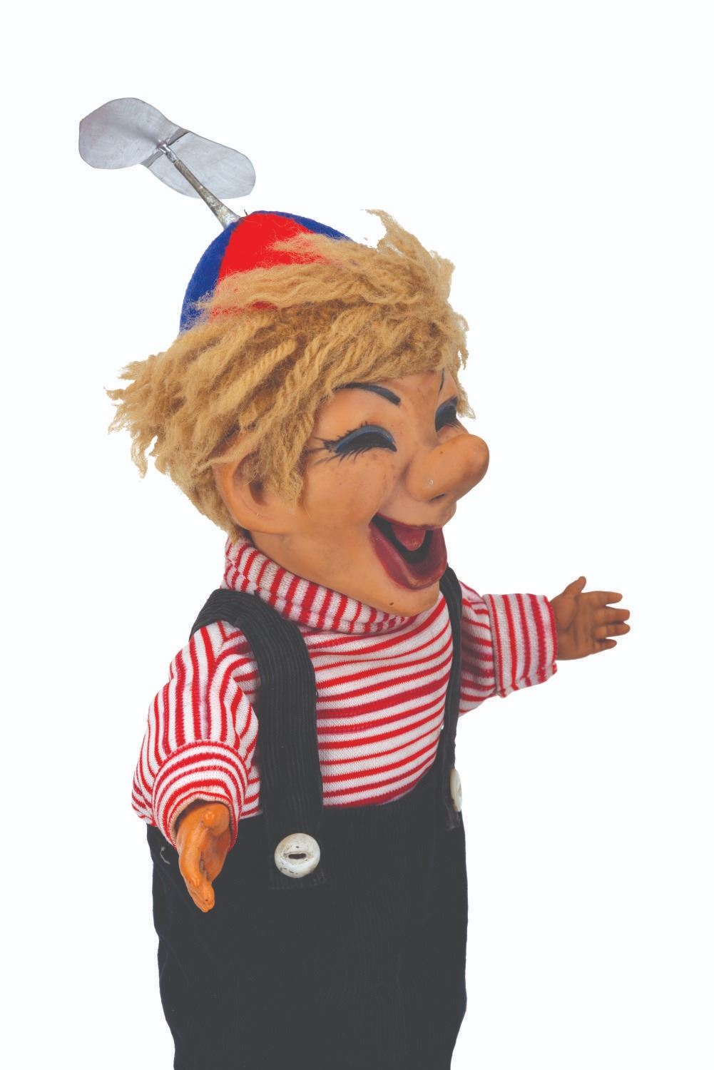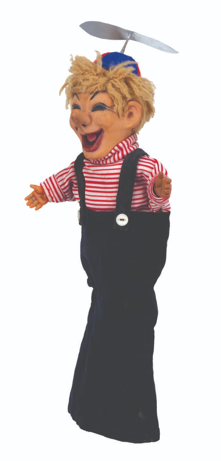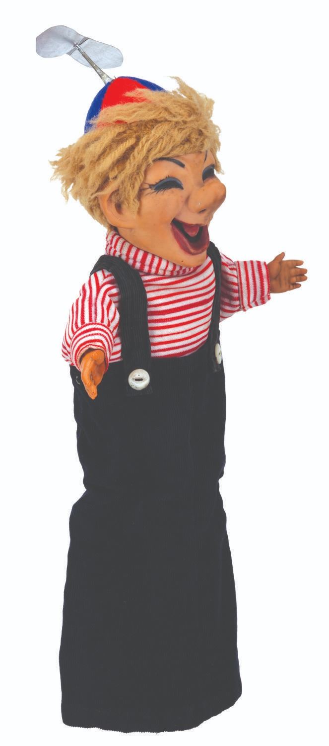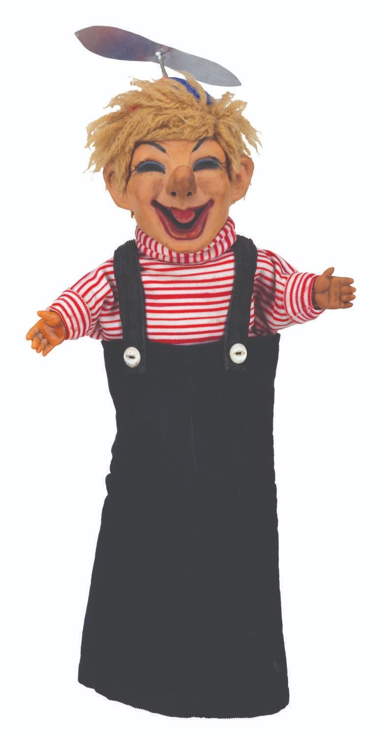 (Clampett, 1949-55) A screen-used Beany Puppet from “Time for Beany.” Beany was performed by voice acting legend, Daws Butler in his very first television role. Butler would go on to voice over 50 of the most well-known cartoon characters including Barney Rubble, Yogi Bear, Elroy Jetson, and Cap’n Crunch. Constructed of rubber, yarn, felt, corduroy, cloth, cotton, and metal and measuring 10” x 3.5” and 17.5” tall, Beany displays in very good condition with two small areas of adhesive residue on the front overalls, light soiling, plasticization on the hands, cracking on the right back button, and light paint wear on the cap propeller.