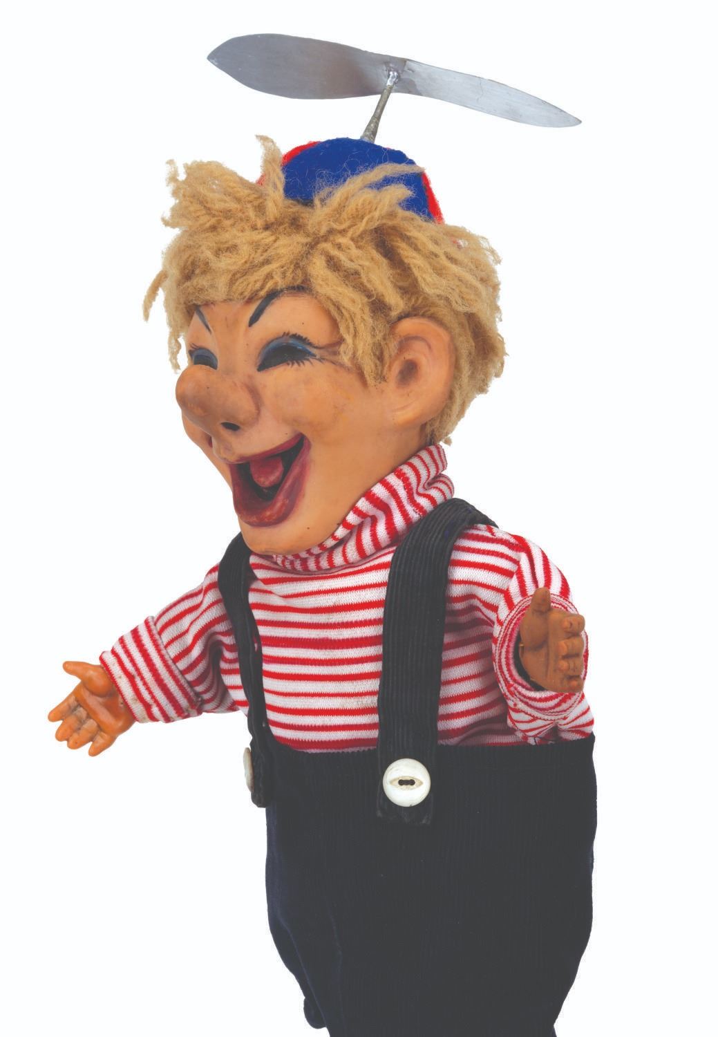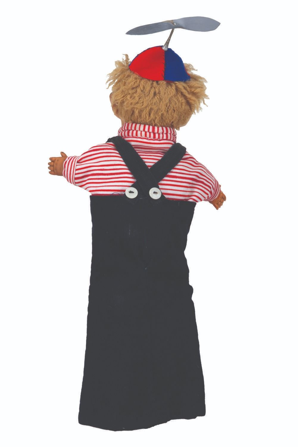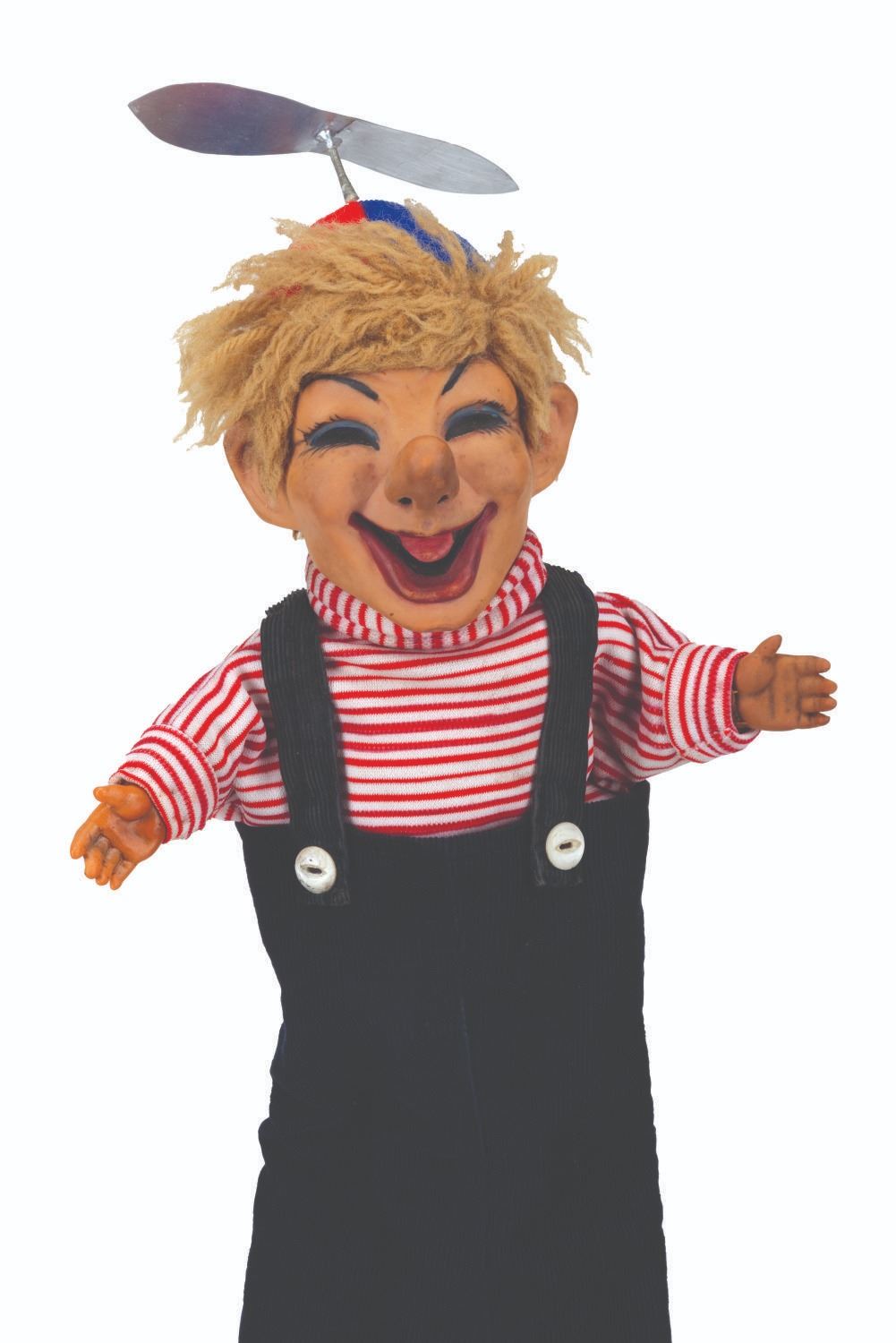 (Clampett, 1949-55) A screen-used Beany Puppet from “Time for Beany.” Beany was performed by voice acting legend, Daws Butler in his very first television role. Butler would go on to voice over 50 of the most well-known cartoon characters including Barney Rubble, Yogi Bear, Elroy Jetson, and Cap’n Crunch. Constructed of rubber, yarn, felt, corduroy, cloth, cotton, and metal and measuring 10” x 3.5” and 17.5” tall, Beany displays in very good condition with two small areas of adhesive residue on the front overalls, light soiling, plasticization on the hands, cracking on the right back button, and light paint wear on the cap propeller.
