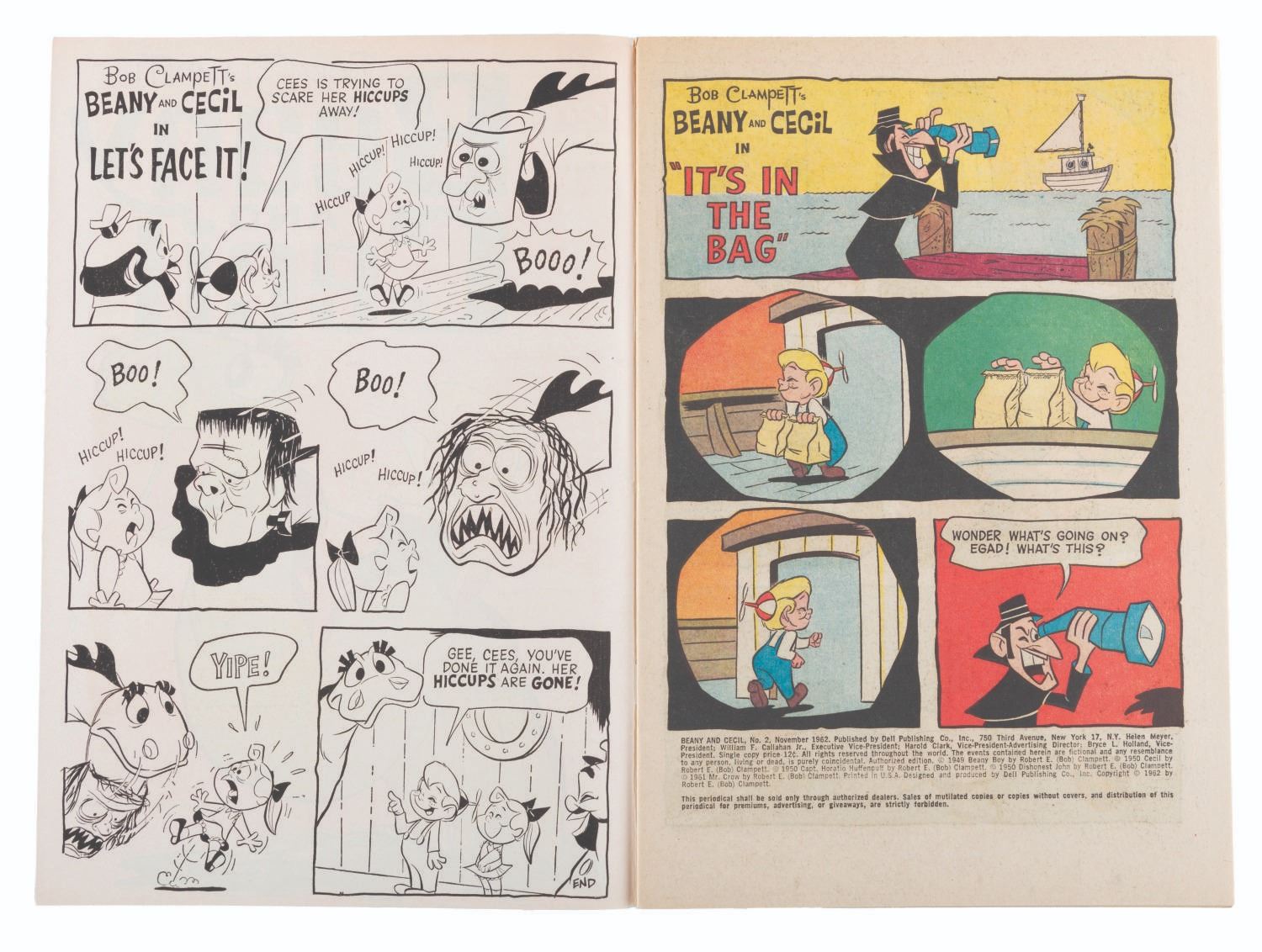 (Dell, 1962) An issue of Beany and Cecil No. 2, published by Dell in November of 1962. Measuring 7” x 10.25”, the comic book is in very good condition with very light handling wear.