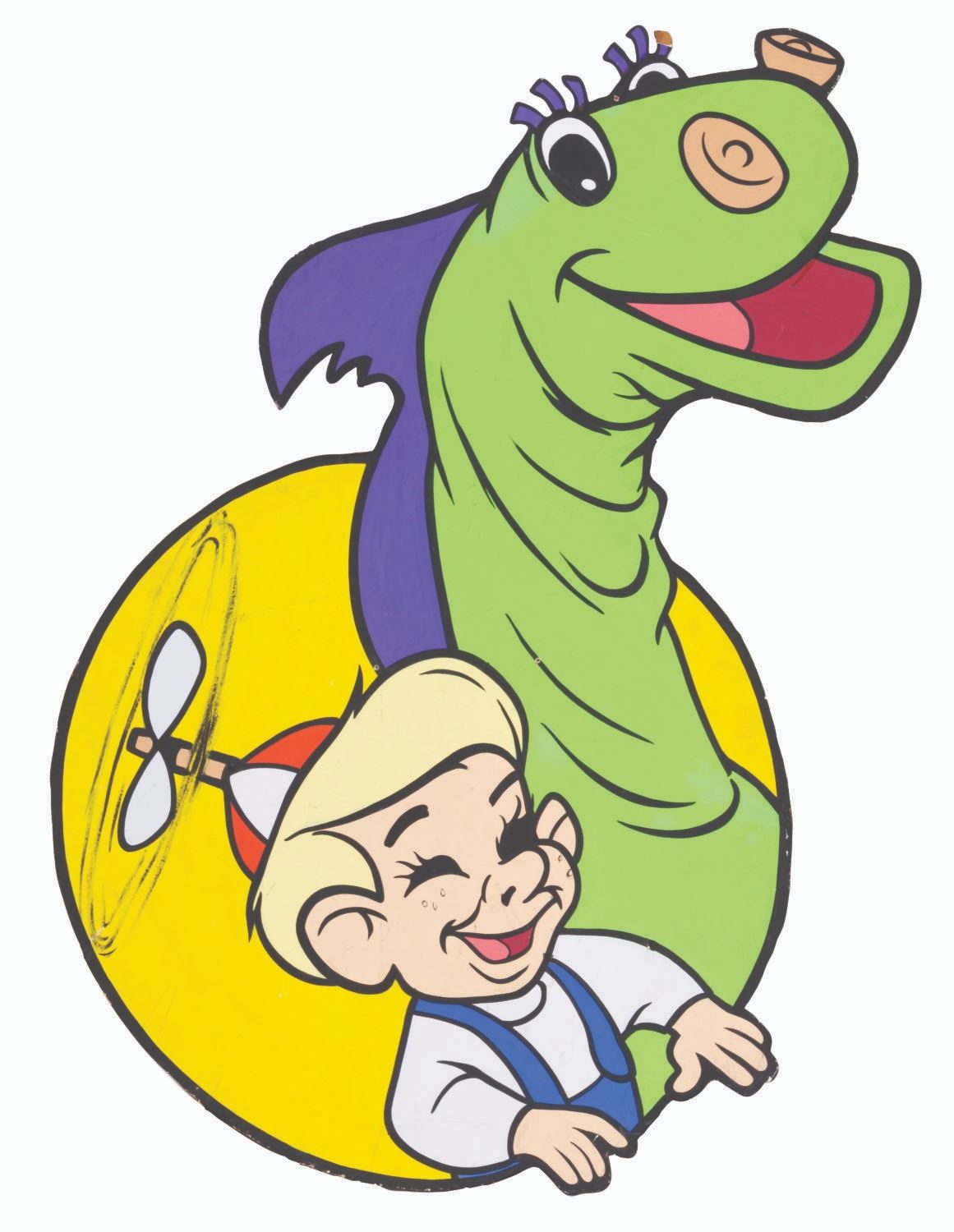 (Clampett, 1960s) A wooden cut-out of the circular “Beany and Cecil” logo. Measuring 39” x 61” and 0.25” thick, the display is in good condition with scuffs, peeling, holes from displays, stains, and wear. Due to size and weight, this item requires special shipping arrangements. Please inquire before bidding.