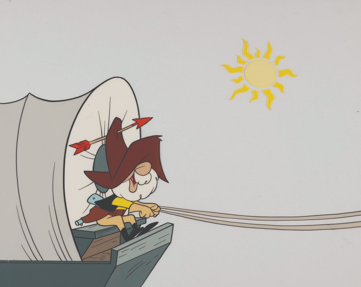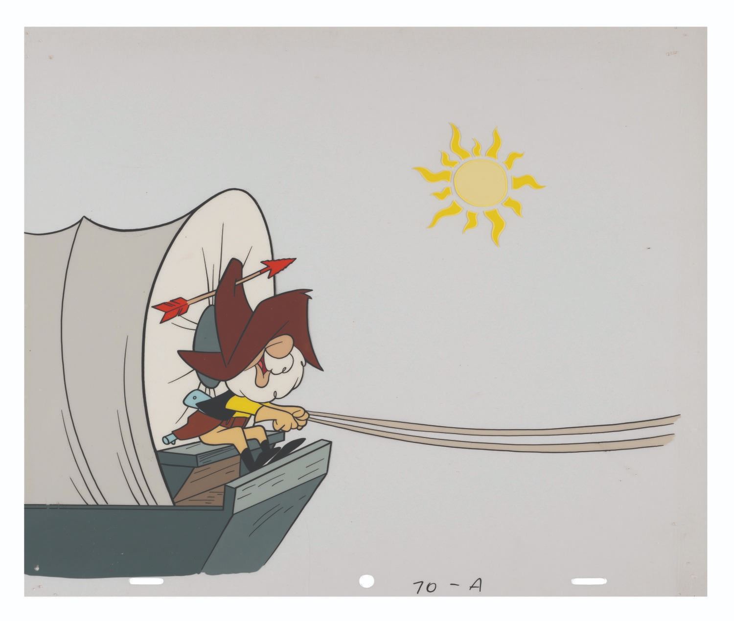 (Clampett, 1962) An original production cel of Pop Gunn from the “Beany and Cecil” episode “Dragon Train.” With an image size of 8.5” x 12” on a 10.5” x 12.5” cel, the piece displays in very good condition with spots of paint loss, scratches, wear, and pinholes from production use.